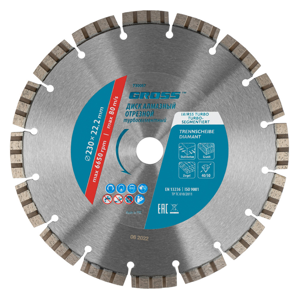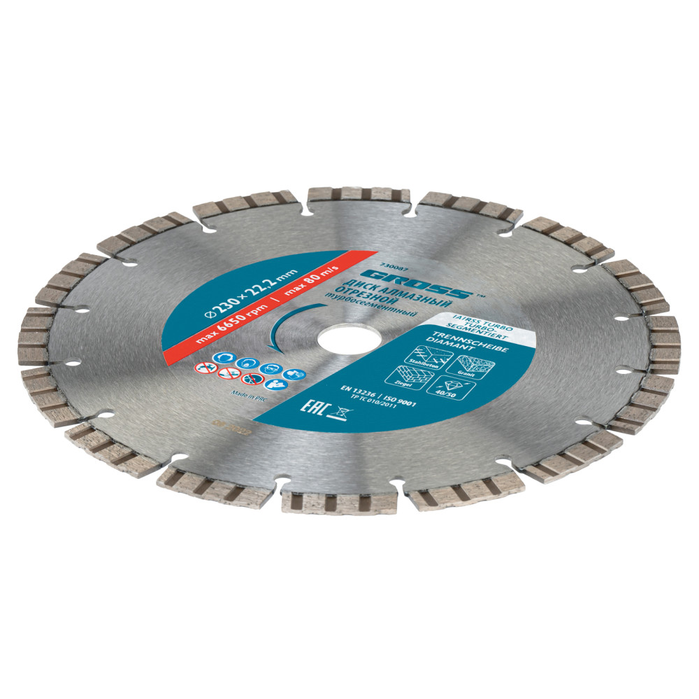 - Турбо-сегментная форма - диск универсален по своему применению, позволяет быстро резать материалы, в т.ч. слабоармированный бетон без риска деформации.