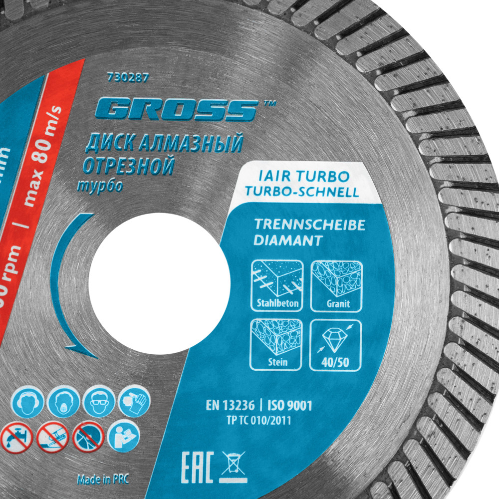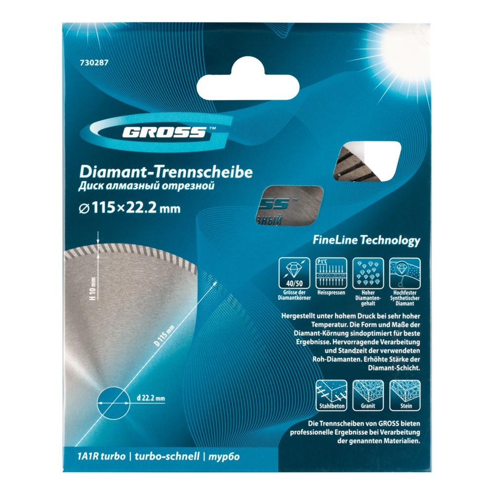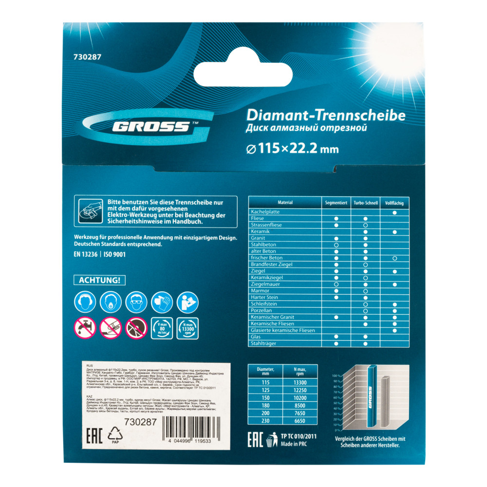 Алмазный диск Gross ф115х22,2мм 730287, турбо, позволяет осуществлять сухое резание бетона, в том числе недавно уложенного, среднеармированного железобетона, кирпича, гранита, камня, песчаника с помощью УШМ. Инструмент подходит для алмазной резки нескольких типов материалов благодаря турбированной рабочей части и оптимальному соотношению компонентов в металлической связке. Высокое качество диска делает его подходящим для профессионального применения.