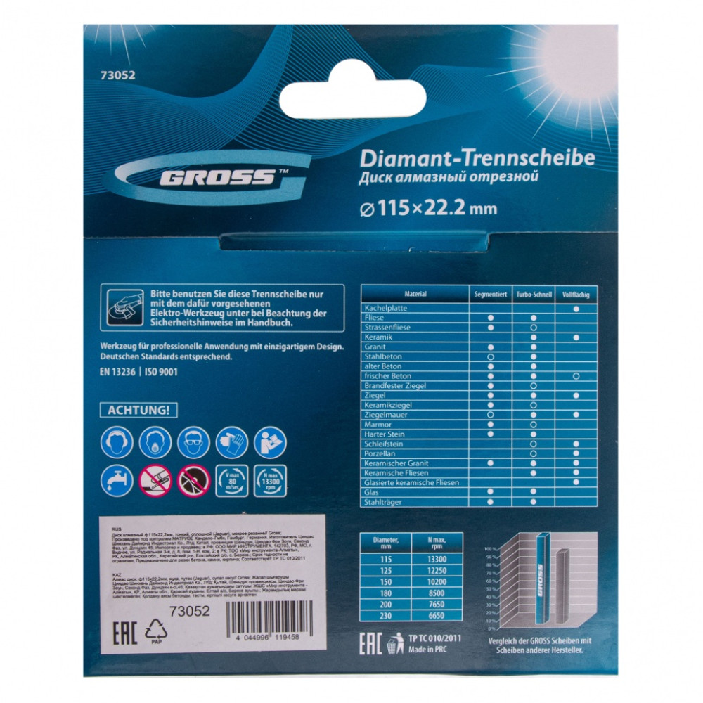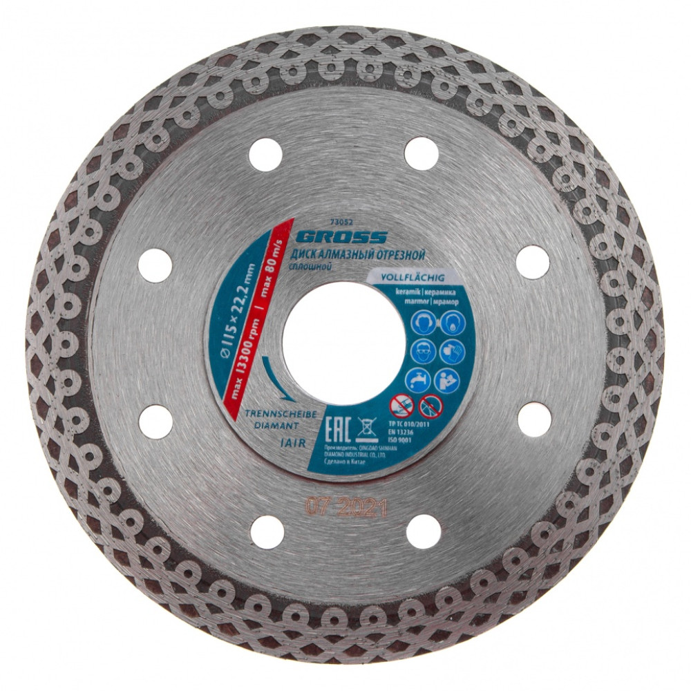 Тонкий сплошной алмазный диск Gross Jaguar ф115х22,2 мм 73052, мокрое резание, подходит для профессионального использования с УШМ или плиткорезами соответствующего типоразмера. Он используется для резки мокрым методом твердых материалов: гранита, керамогранита, плитки, мрамора и камня. Диск оставляет ровный срез без трещин и сколов за счет сплошной формы. При мокрой резке вода охлаждает диск и удаляет пыль с рабочей зоны, поэтому он легко справляется с большими объемами работ. Тонкий диск 1,2 мм значительно увеличивает скорость реза.