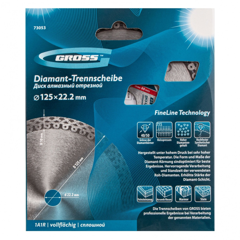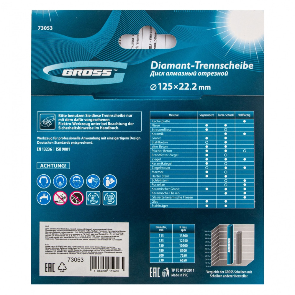 Тонкий сплошной алмазный диск Gross Jaguar ф125 х 22,2 мм 73053, подходит для профессионального мокрого резания с помощью УШМ или плиткореза соответствующего типоразмера. Используется для резки мокрым методом твердых материалов: гранита, керамогранита, плитки, мрамора и камня. Диск оставляет ровный срез без трещин и сколов за счет сплошной формы. При мокрой резке вода охлаждает диск и удаляет пыль с рабочей зоны, поэтому он легко справляется с большими объемами работ. За счет небольшой толщины диска 1,2 мм значительно увеличивается скорость реза.
