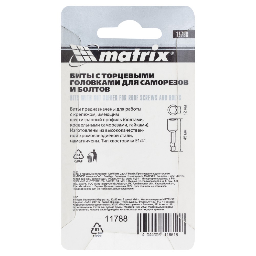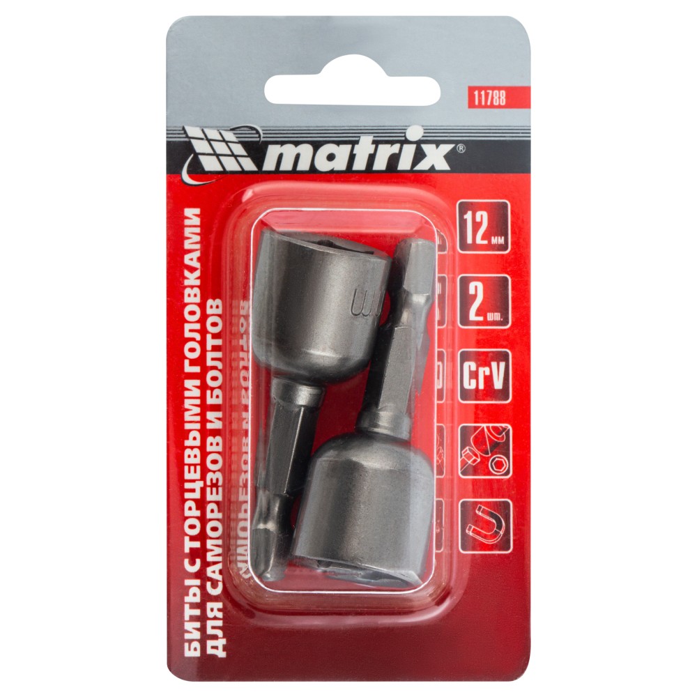 Биты с торцевыми головками Matrix 11788 размером 12 х 45 мм, 2 шт. в уп., предназначены для работ с шуруповертом. Используются при монтаже и демонтаже болтов и шурупов, а также кровельных саморезов с внешним шестигранником. Увеличенная длина 45 мм облегчает работу в труднодоступных местах. Биты способны полностью заменить торцевые головки, особенно если под рукой нет трещотки. ПреимуществаПрочность и коррозионная стойкость — биты изготовлены из высококачественной стали CrV.Встроенный магнит — оснастка надежно соединяется с головкой крепежа.Долговечность — биты прошли пескоструйную обработку и имеют защитное покрытие, повышающее устойчивость к износу.Удобная комплектация — в наборе 2 насадки, которые помогут решить большой объем задач.