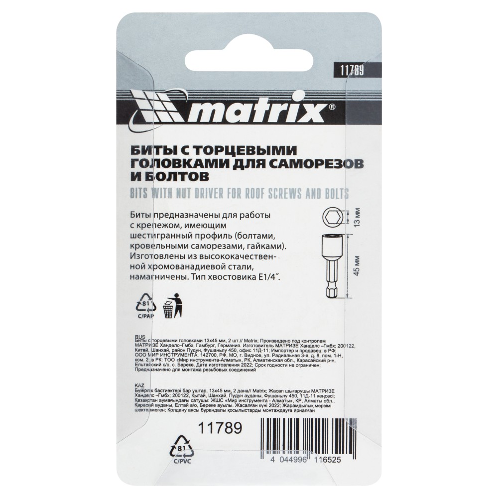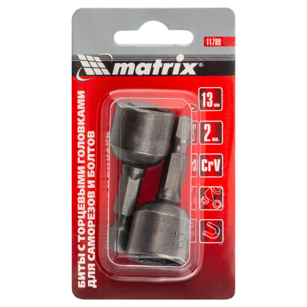 Биты с торцевыми головками Matrix 11789 размером 13 х 45 мм, 2 шт. в уп., предназначены для работ с шуруповертом. Используются при монтаже и демонтаже болтов и шурупов, а также кровельных саморезов с внешним шестигранником. Увеличенная длина 45 мм облегчает работу в труднодоступных местах. Биты способны полностью заменить торцевые головки, особенно если под рукой нет трещотки. ПреимуществаПрочность и коррозионная стойкость — биты изготовлены из высококачественной стали CrV.Встроенный магнит — оснастка надежно соединяется с головкой крепежа.Долговечность — биты прошли пескоструйную обработку и имеют защитное покрытие, повышающее устойчивость к износу.Удобная комплектация — в наборе 2 насадки, которые помогут решить большой объем задач.