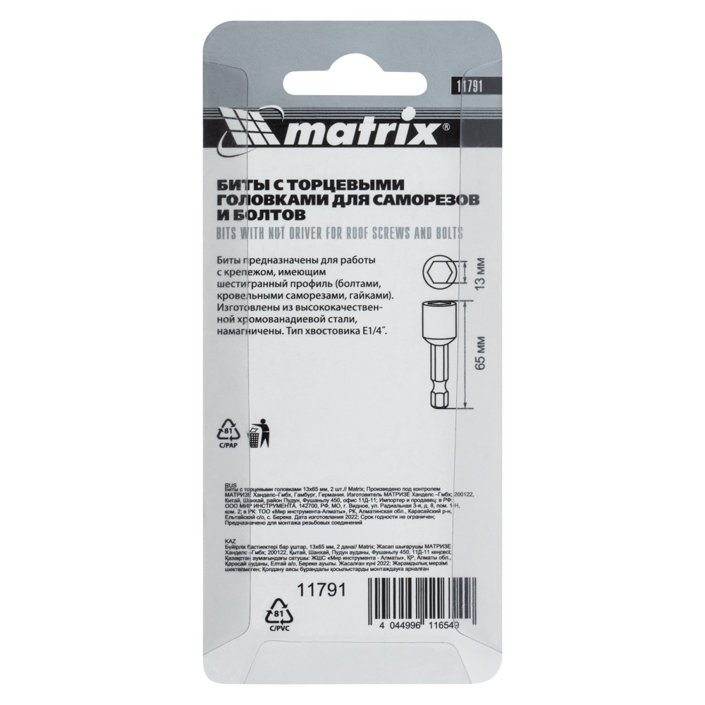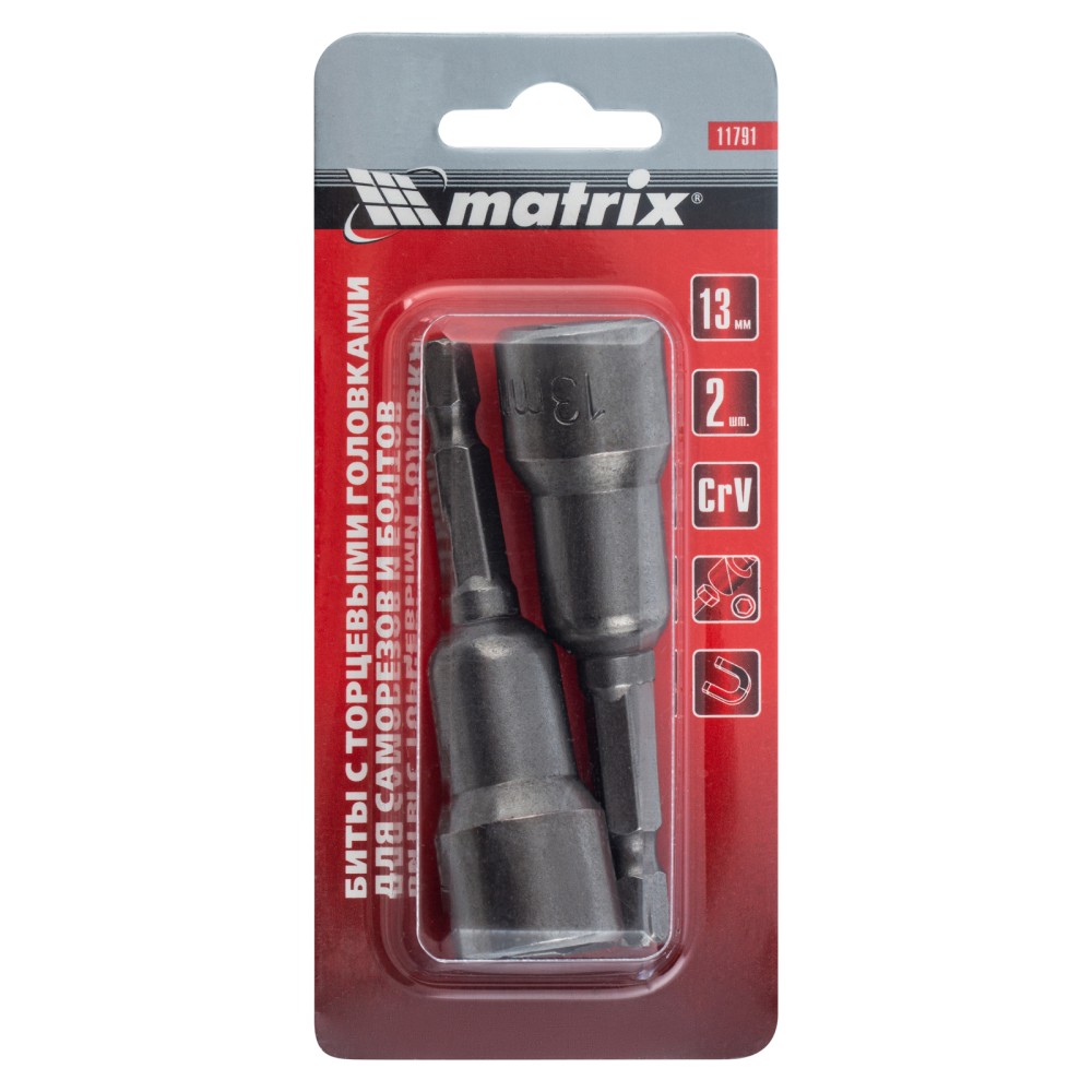Биты с торцевыми головками Matrix 11791 размером 13 х 65 мм, 2 шт. в уп., предназначены для работ с шуруповертом. Используются при монтаже и демонтаже болтов и шурупов, а также кровельных саморезов с внешним шестигранником. Увеличенная длина 65 мм облегчает работу в труднодоступных местах. Биты способны полностью заменить торцевые головки, особенно если под рукой нет трещотки. ПреимуществаПрочность и коррозионная стойкость — биты изготовлены из высококачественной стали CrV.Встроенный магнит — оснастка надежно соединяется с головкой крепежа.Долговечность — биты прошли пескоструйную обработку и имеют защитное покрытие, повышающее устойчивость к износу.Удобная комплектация — в наборе 2 насадки, которые помогут решить большой объем задач.