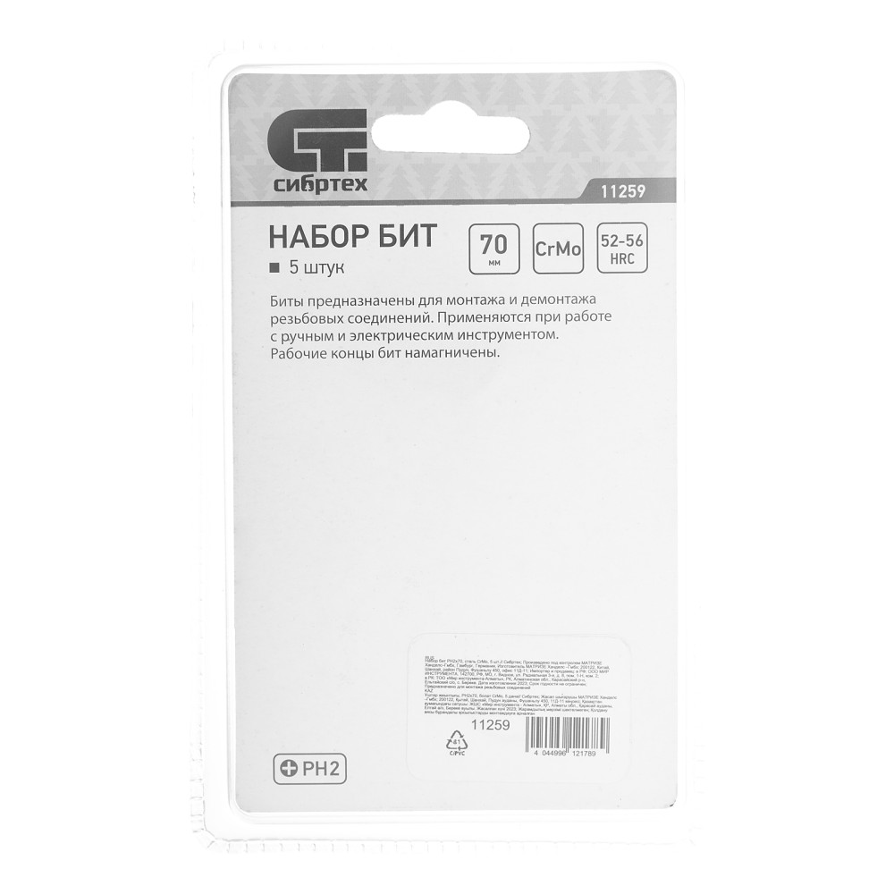 Набор бит Сибртех 11259 включает 5 крестообразных насадок PH2 x 70 мм из стали CrMo, с шестигранным присоединительным хвостовиком. Они используются в качестве сменной оснастки для шуруповертов, реверсивных и электрических отверток. Биты PH2 подходят для монтажа и демонтажа винтов и саморезов соответствующего типоразмера во время сборки мебели, проведения строительных, монтажных и ремонтных работ.ПреимуществаДолговечность — биты изготовлены из износостойкой хромомолибденовой стали твердостью 52-56 HRC.Длина 70 мм — работать удобно даже в труднодоступных местах.Высокое качество — насадки прошли пескоструйную обработку.Удобная комплектация — в наборе 5 бит, которых хватит надолго.