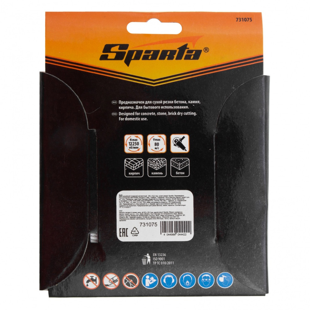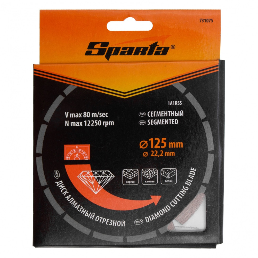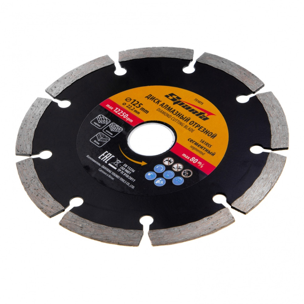 Диск алмазный отрезной сегментный Sparta 731075, 125 х 22,2 мм, применяется для сухой резки бетона, камня, шлакоблока, тротуарной плитки и кирпича. Устанавливается на углошлифовальные машины с посадочным диаметром 22,2 мм. Оптимален для решения бытовых задач. Благодаря высокому рабочему ресурсу диск подходит для интенсивной работы.