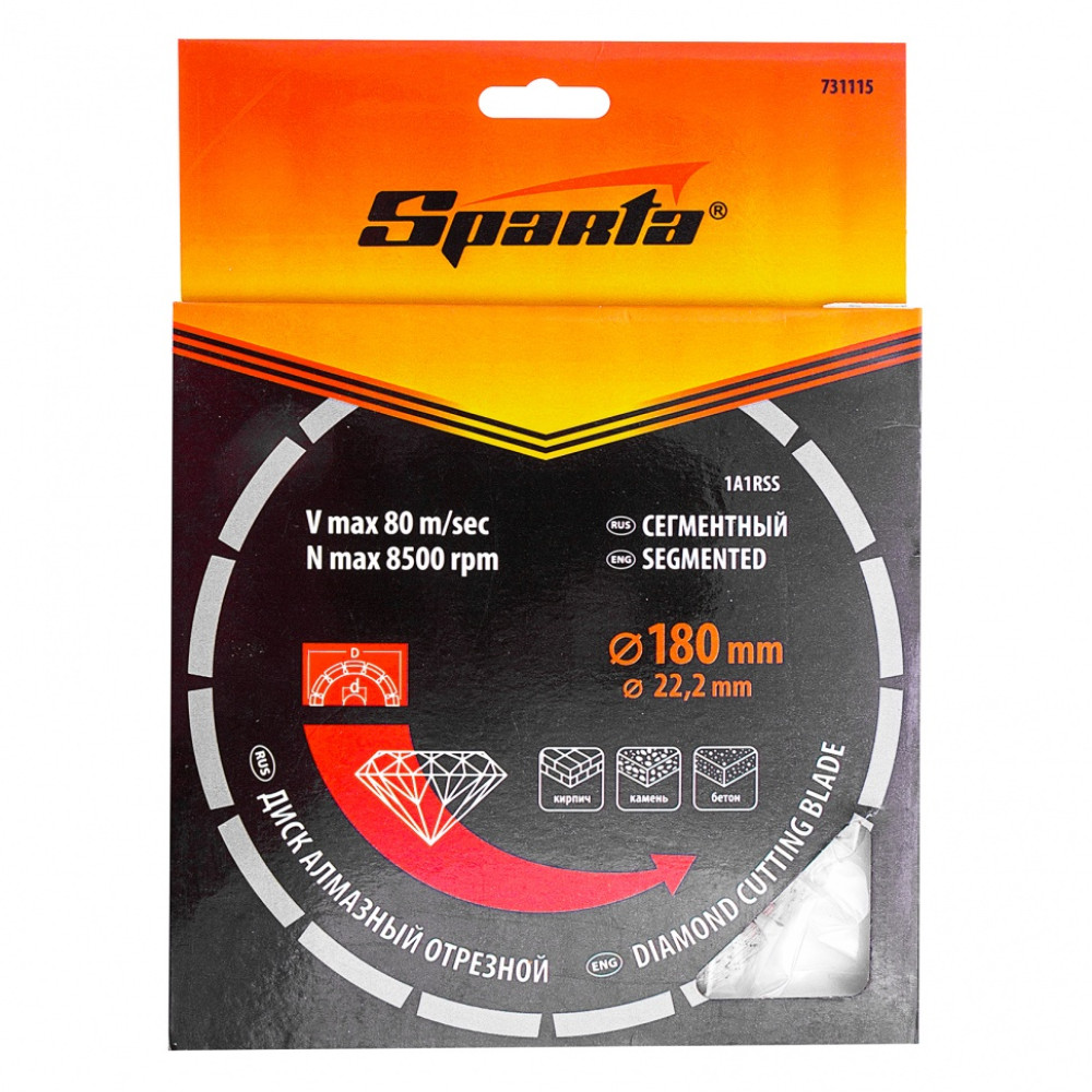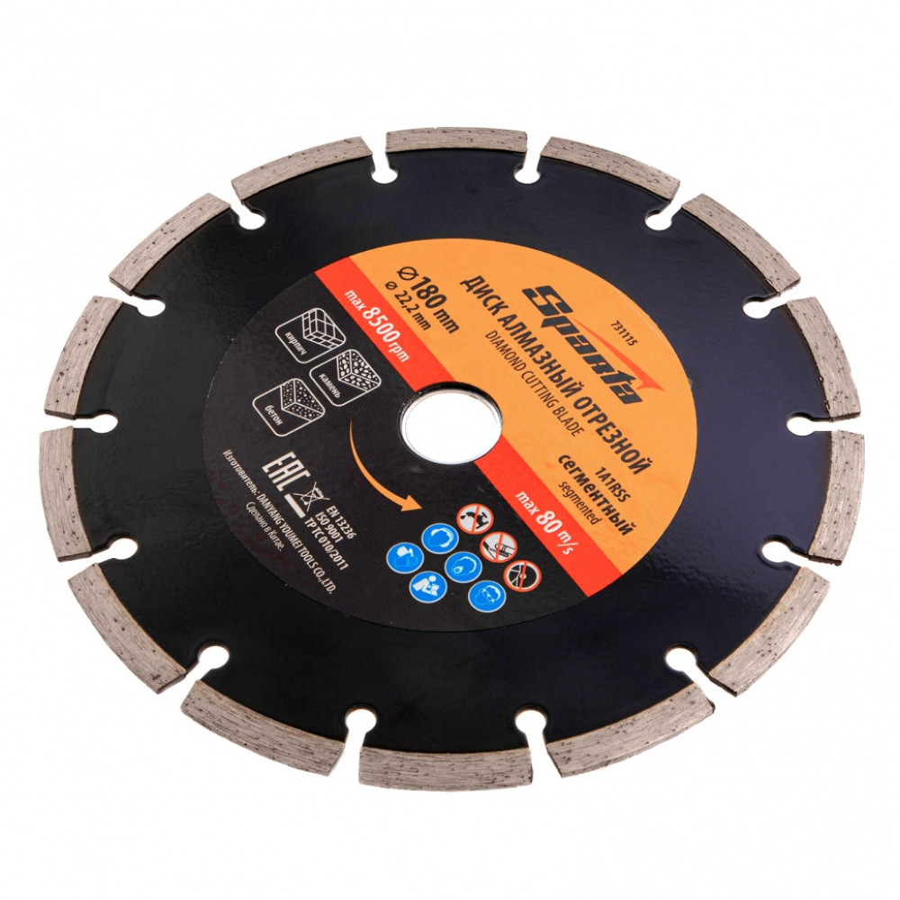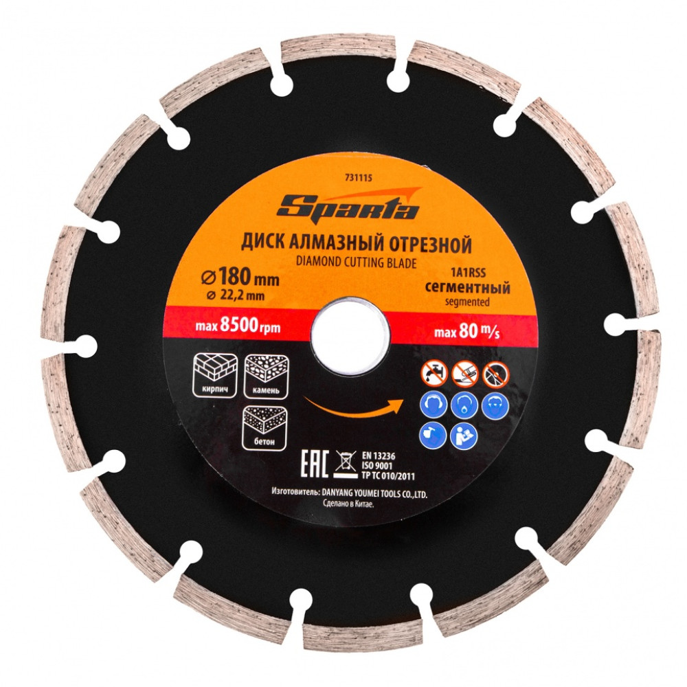 Диск алмазный отрезной сегментный Sparta 731115, 180 х 22,2 мм, применяется для сухой резки бетона, камня, шлакоблока, тротуарной плитки и кирпича. Устанавливается на углошлифовальные машины с посадочным диаметром 22,2 мм. Оптимален для решения бытовых задач. Благодаря высокому рабочему ресурсу диск подходит для интенсивной работы.