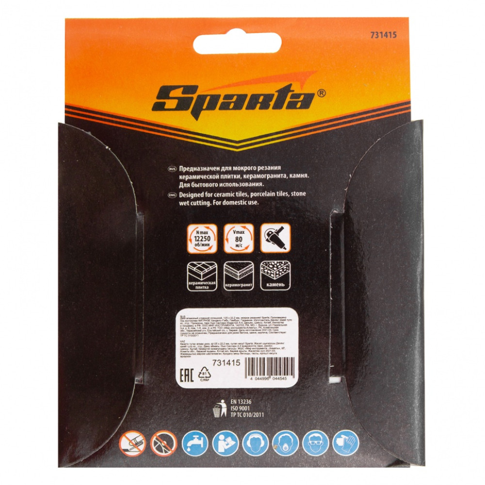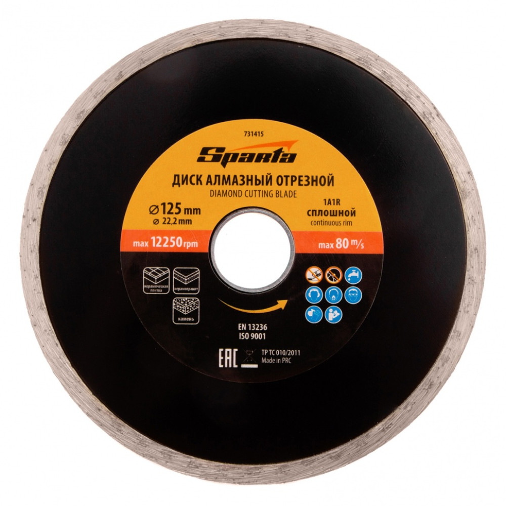 Отрезной алмазный диск Sparta 731415, сплошной, 125 х 22,2 мм - расходный инструмент для болгарок и плиткорезов, используемый для мокрого резания. Он позволяет выполнить аккуратный рез по керамике, керамограниту и мрамору в бытовых условиях. Рекомендуется применять с использованием водяного охлаждения.