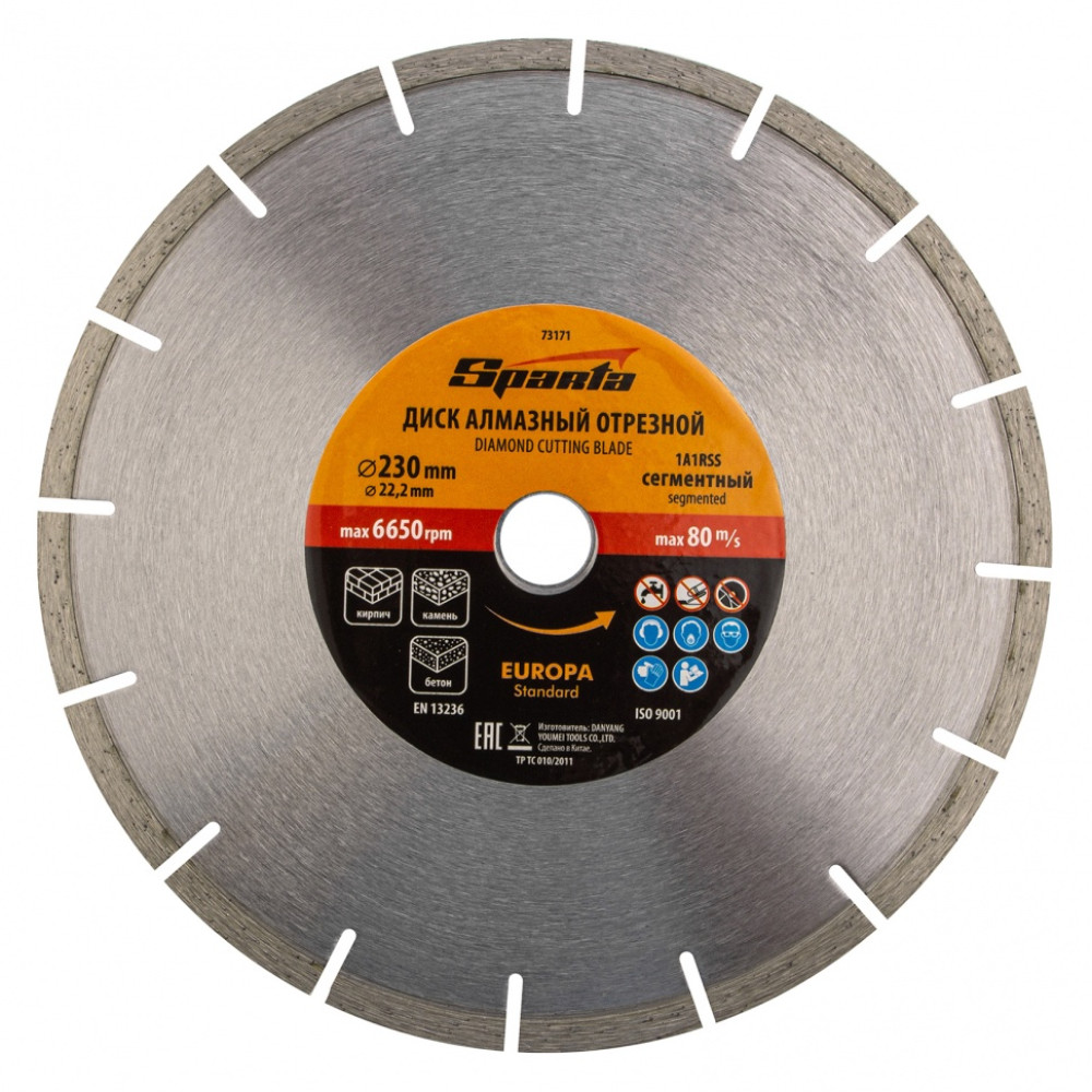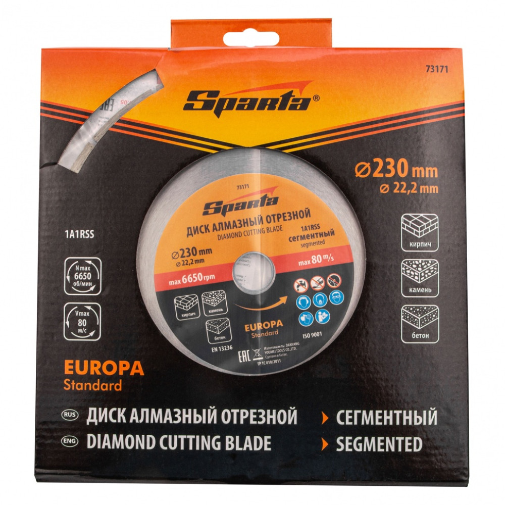Диск алмазный отрезной сегментный Sparta EUROPA Standart 73171, 230 х 22,2 мм, предназначен для сухой резки бетона, в том числе свежего, камня, кирпича, шлакоблока и тротуарной плитки. Он устанавливается на углошлифовальные машины с посадочным диаметром 22,2 мм. Диск оптимально подходит для бытового использования.
