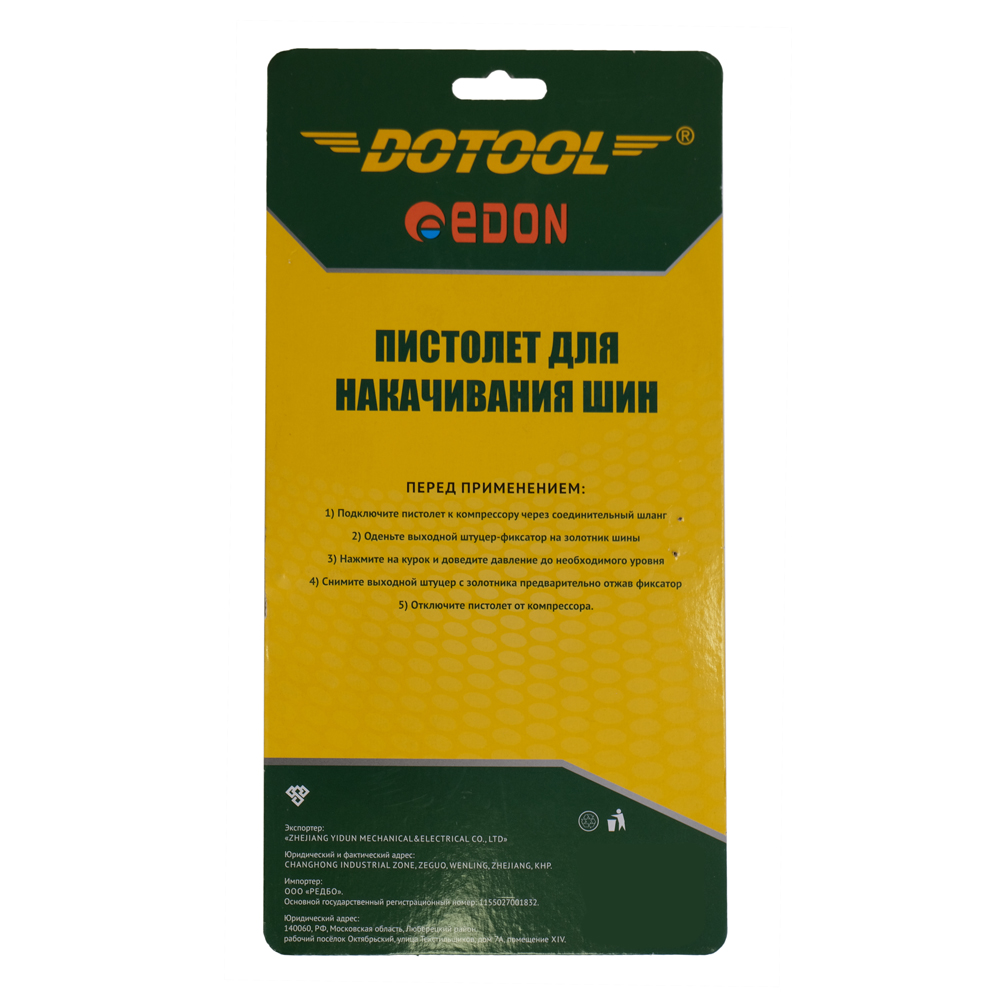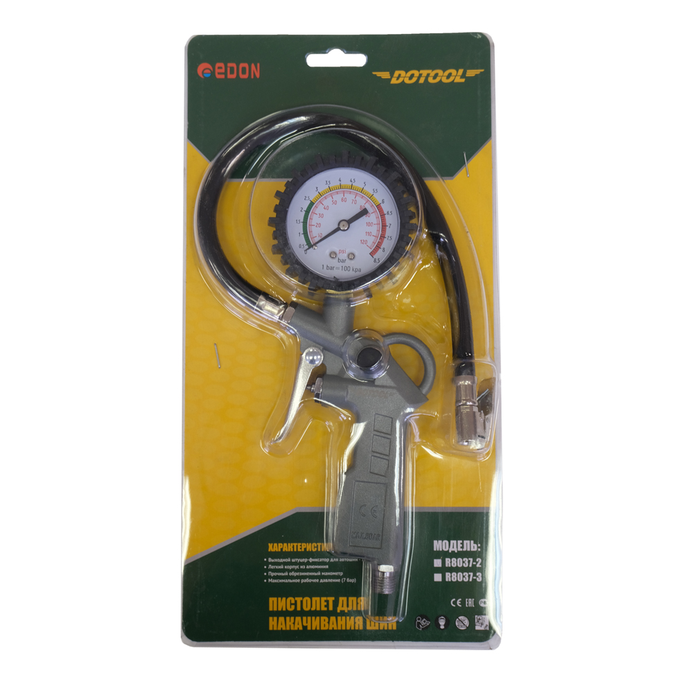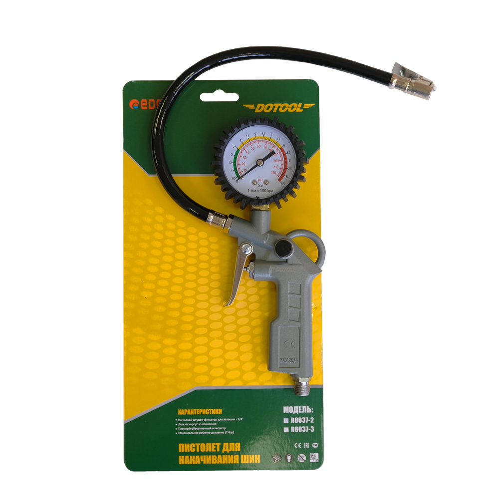 - Пистолет для накачки шин Edon RP8037-2 DOTOOL имеет прочный корпус из алюминия и прочный обрезиненный манометр.