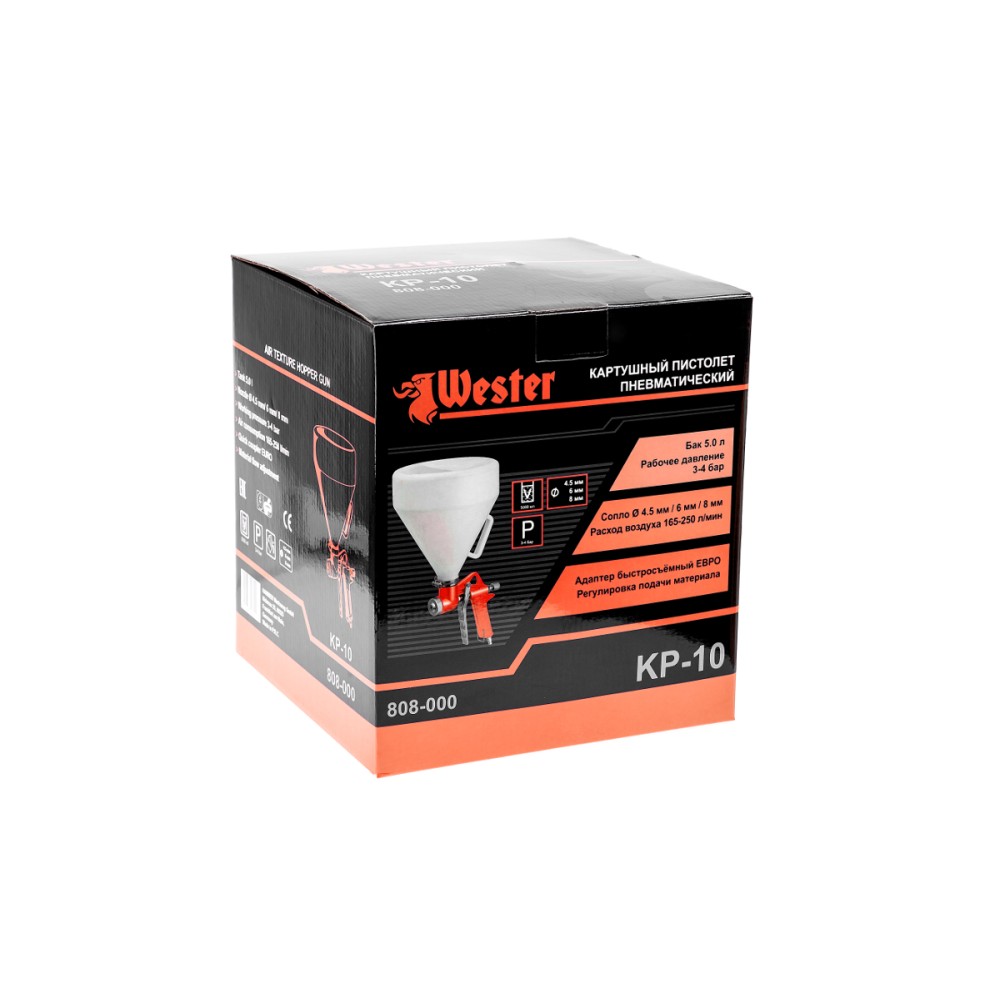 WESTER KP-10 - картушный пистолет для декоративно-штукатурных работ с применением гранитной крошки, жидких обоев, тяжёлой краски, штукатурки, шпатлёвки. Смесь «вбивается» в стену под высоким давлением, заполняя поры и полости. Материал наносится ровно и аккуратно.