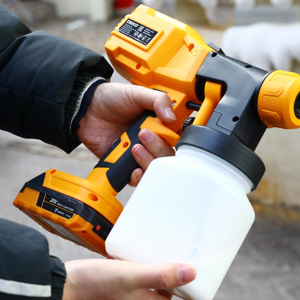 - Краскопульт аккумуляторный DEKO SG20DK, 1x3.0Ah используется для обработки поверхности водно-меловыми и водно-известковыми составами при строительно-отделочных работах, при опрыскивании и побелке садов, дезинфекции помещений.