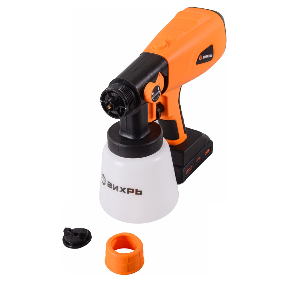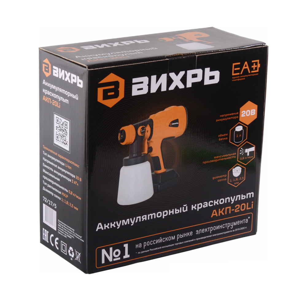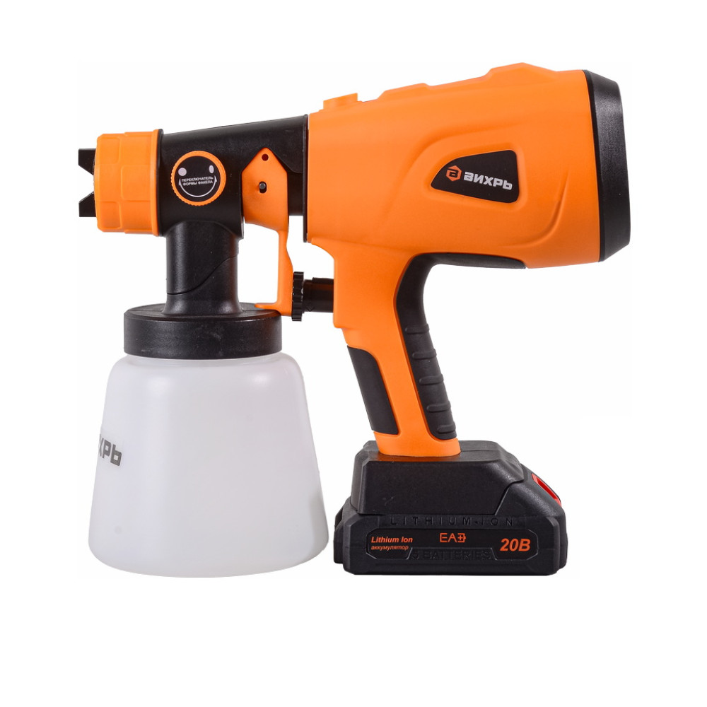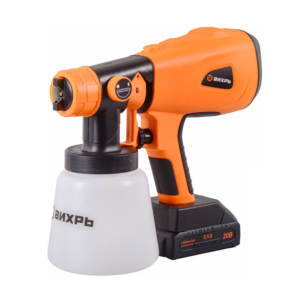 - Краскопульт аккумуляторный АКП-20Li Вихрь - это портативный инструмент, который предназначен для быстрой и качественной обработки поверхностей лакокрасочными материалами. Модель оснащена литий-ионной батареей с напряжением 20 В и емкостью 3 А·ч, а также зарядным устройством, что дает возможность использовать его независимо от электросети. Это особенно полезно при выполнении работ на открытом воздухе или в местах с ограниченным доступом к электричеству. Батарея совместима с системой EA+ (единой аккумуляторной платформой), что повышает универсальность использования.