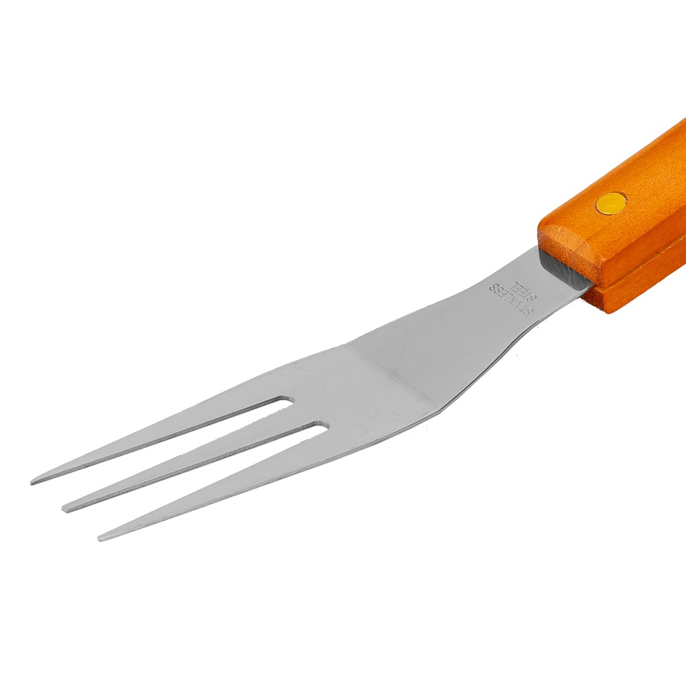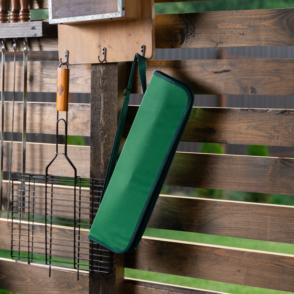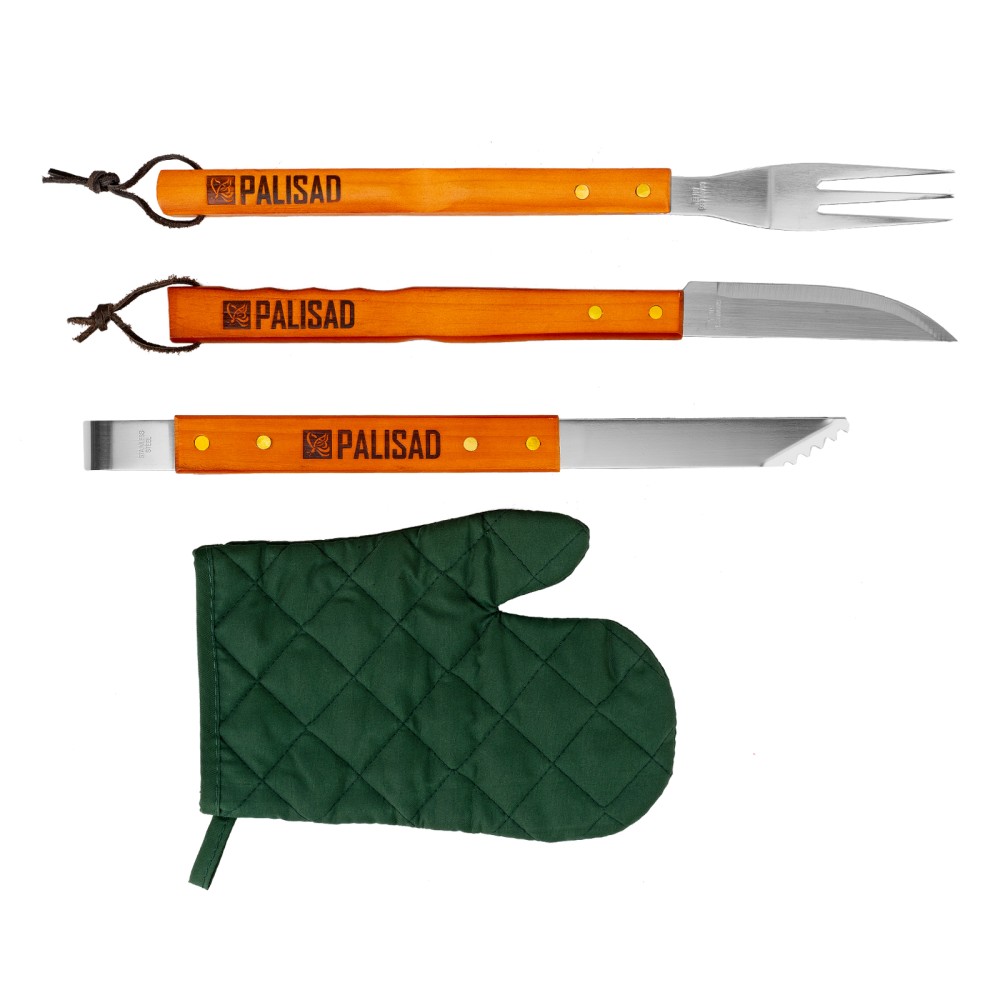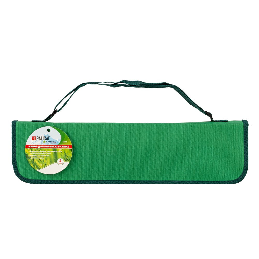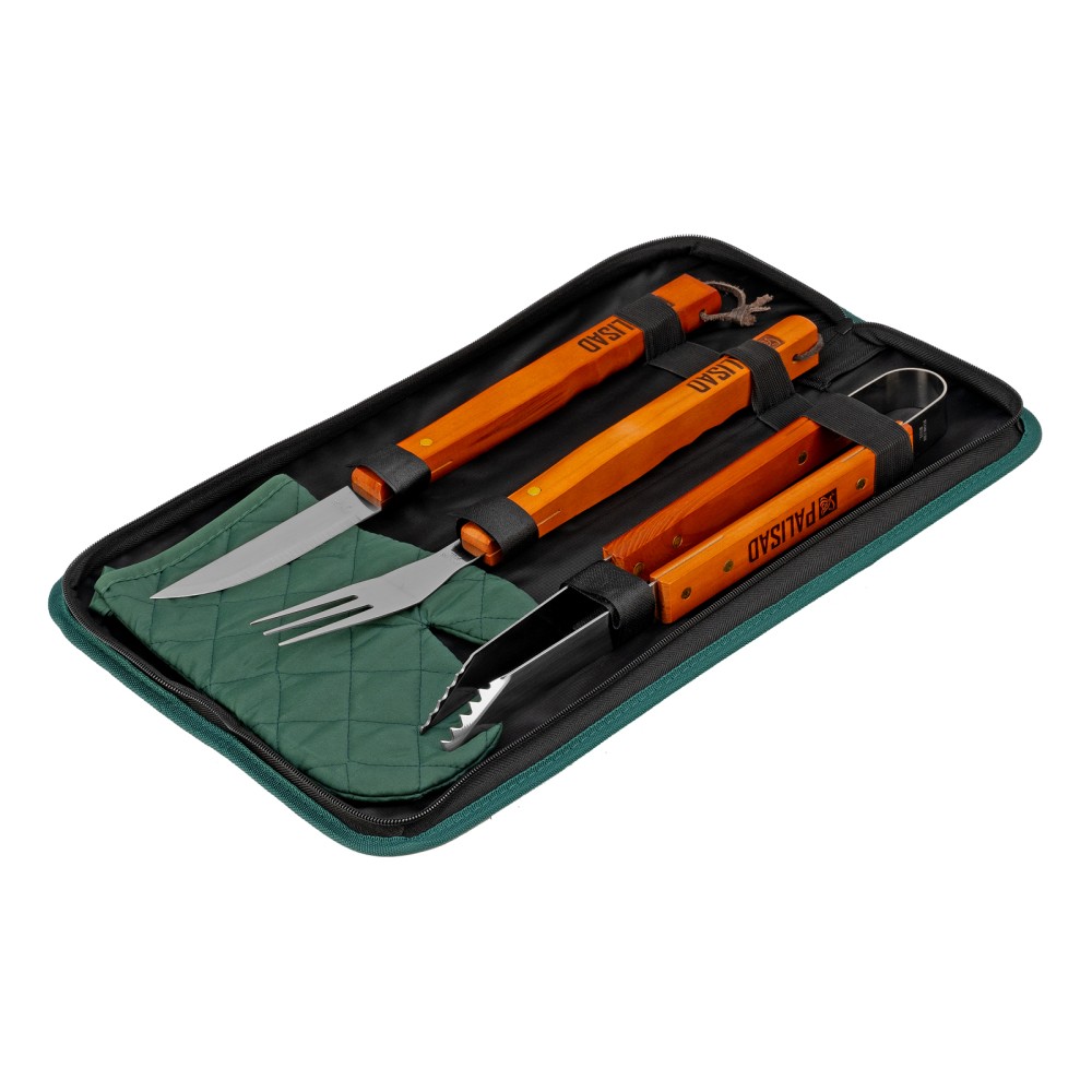 Набор приборов для барбекю Palisad Camping 69578 содержит 4 предмета в сумке, которые повышают безопасность и удобство приготовления блюд на мангале. Пригодится любителям пикников и дачникам. В наборе есть все необходимое: вилка для захвата продуктов и проверки степени их готовности, щипцы для переворачивания, рукавичка для удержания горячих предметов.ПреимуществаПриборы с рабочей частью из пищевой нержавеющей стали обладают прочностью и долговечностью.Удлиненные рукоятки повышают безопасность работы, снижая риск травмирования повара.При случайном контакте с горячими поверхностями рукоятки не нагреваются, это защищает пользователя от ожогов.Деревянные рукоятки приятны на ощупь, поэтому с приборами комфортно работать.Компактная сумка позволяет с удобством транспортировать и хранить набор.