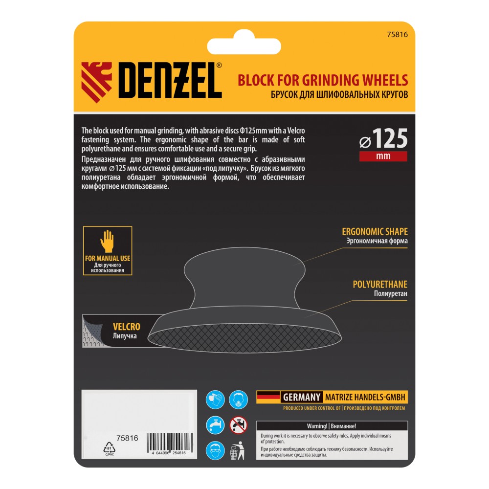 Круглый брусок для шлифования Denzel 75816 с креплением под «липучку» предназначен для выполнения ручных шлифовальных работ с использованием абразивных кругов диаметром 125 мм. Подходит для влажной шлифовки, оптимален для бытового применения.ПреимуществаБыстрая подготовка к работе — шлифовальный круг фиксируется при помощи «липучки» VELCRO за несколько секунд, а благодаря улучшенной форме крючков зацеп осуществляется на 30% надежнее по сравнению со стандартной «липучкой».Мягкая основа — брусок из полиуретана обеспечивает эффективную обработку различных поверхностей.Эргономичность — брусок продуманной формы удобно держать в руке, что обеспечивает комфорт во время работы.