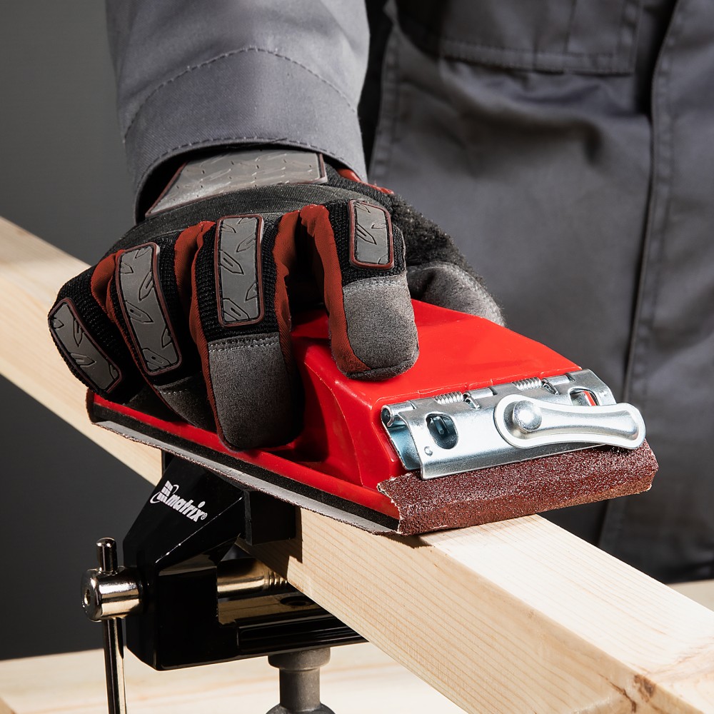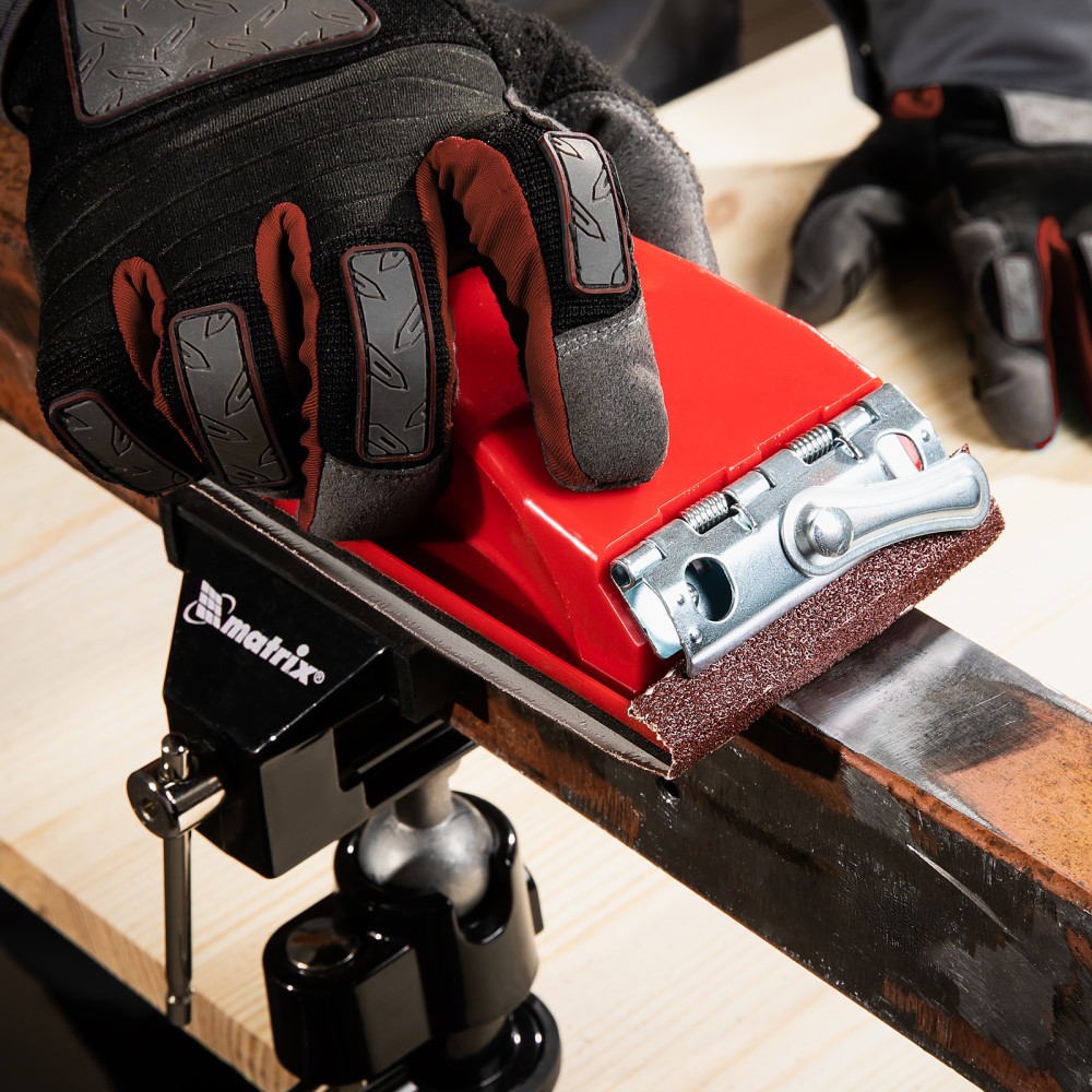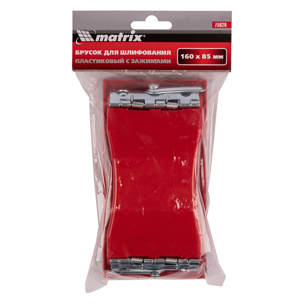 Пластиковый брусок для шлифования Matrix 75820 с зажимами, с размером подошвы 160 х 85 мм, применяется для ручной шлифовки плоских поверхностей. На него устанавливают абразивный лист или сетку любой зернистости. Инструмент используется для проведения строительных, ремонтных, кузовных работ.ПреимуществаПрочность и долговечность — брусок из высококачественного и нетоксичного АБС-пластика не ржавеет и не деформируется.Простая подготовка к работе — быстрозажимной механизм позволяет надежно зафиксировать шлифовальный материал.Эффективная работа — мягкое основание обеспечивает высокое качество шлифовки, особенно при работе с мелкозернистым абразивом.Эргономичность — благодаря боковым выемкам на корпусе брусок удобно держать в руке, что особенно удобно для длительной работы.