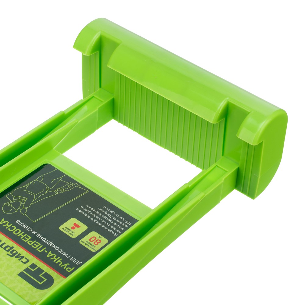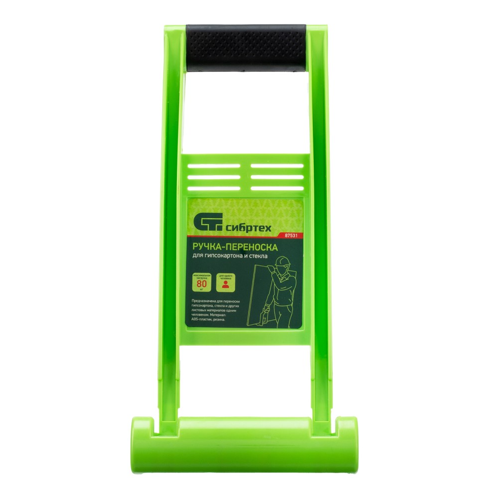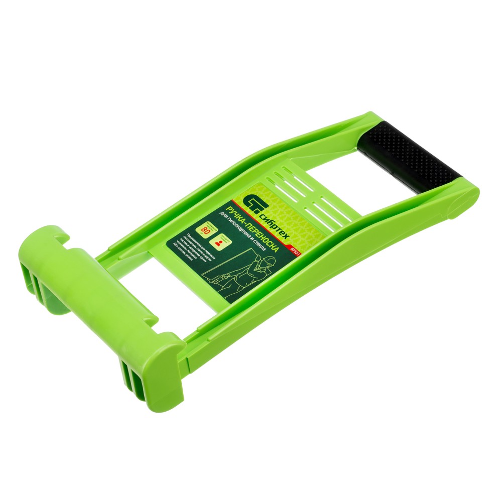 Ручка-переноска для гипсокартона и стекла Сибртех 87531 используется для перемещения вручную крупногабаритных гипсокартонных листов, фанеры и других листовых материалов в одиночку. Будет полезна во время строительных, ремонтных и погрузо-разгрузочных работ.ПреимуществаПрочность — переноска для гипсокартона изготовлена из ударопрочного ABS-пластика и выдерживает вес 80 кг.Удобный хват — ручка имеет противоскользящее покрытие и надежно лежит в руке.Комфортность использования — конструкция ручки-переноски позволяет надежно зафиксировать листы материала, которые затем легко можно переместить, придерживая свободной рукой.