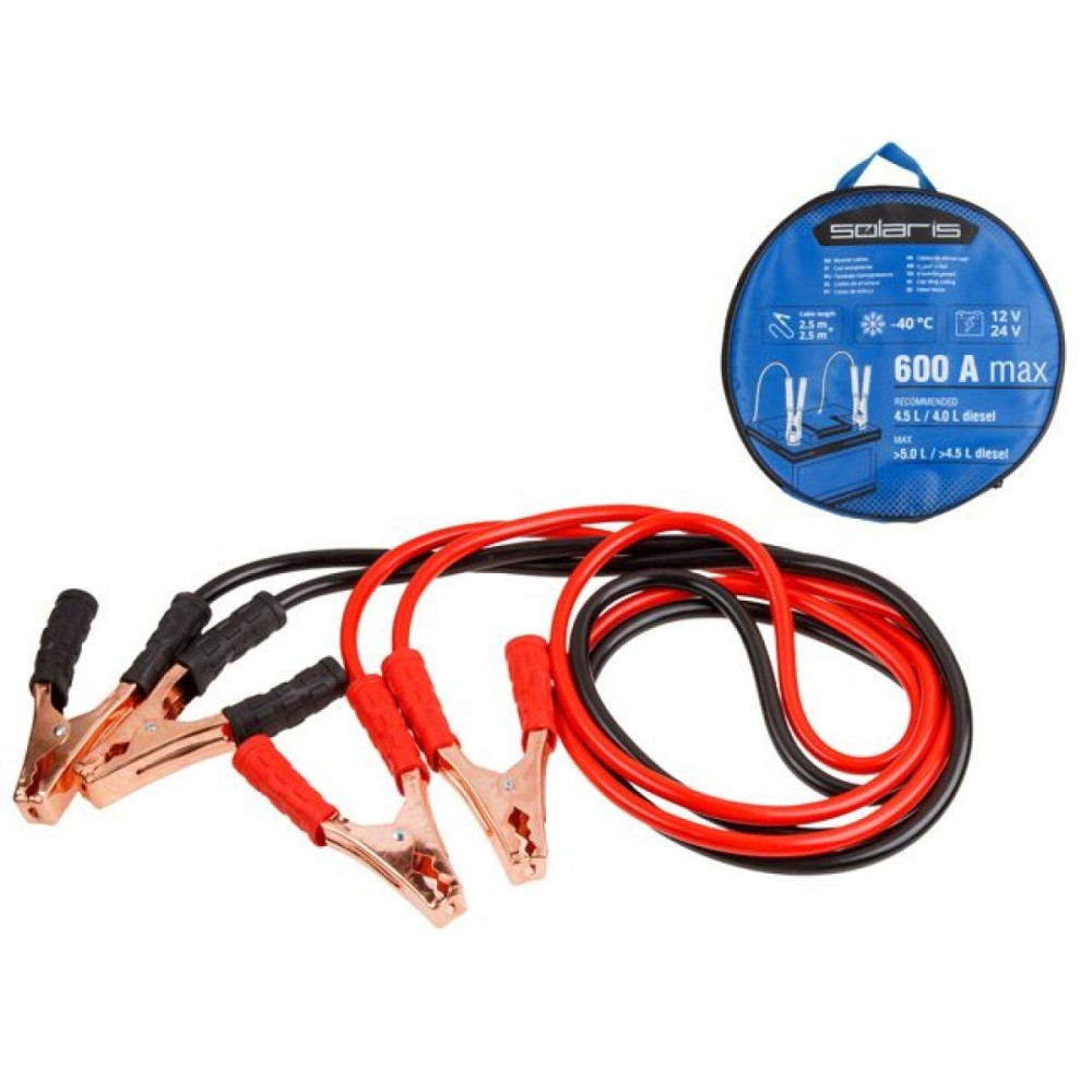 Провода изолированы термопластичной резиной, благодаря чему они легко гнутся и не теряют свою эластичность до температуры -40С, а длина проводов позволяет дотянутся до аккумулятора автомобиля донора, даже при парковке в труднодоступных местах.