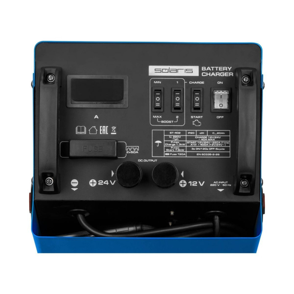 Пуско-зарядное устройство ST-402 предназначено для заряда свинцово-кислотных 12 В и 24 В аккумуляторных батарей (АКБ) автомобилей, грузовиков, микроавтобусов, тракторов, сельхозмашин емкостью от 20 до 800 Ач. Возможна зарядка нескольких аккумуляторов при параллельном подключении с разной емкостью, которая должна суммарно соответствовать величине не более 800 Ач.