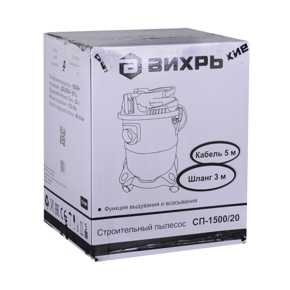 - Строительный пылесос СП-1500/20 Вихрь предназначен для сухой и влажной уборки помещений, а также для совместного использования с электроинструментом при принудительном удалении продуктов сгорания, пиления.