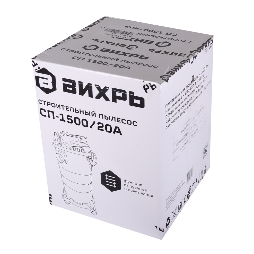 - Строительный пылесос Вихрь СП-1500/20А предназначен для сухой и влажной уборки помещений, а также для совместного использования с электроинструментом при принудительном удалении продуктов строгания, пиления и т.д.