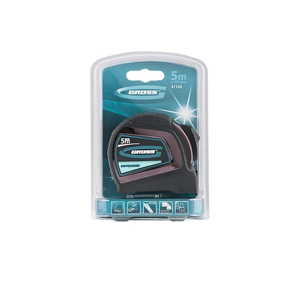 Автоматическая рулетка Gross «Doppelhaken» 31123 с односторонним зацепом, лентой 5 м x 19 мм, двухсторонней шкалой и нейлоновым покрытием, пригодится в хозяйстве и на строительной площадке. С ее помощью можно осуществить замеры стен, полов, различных материалов и конструкций.