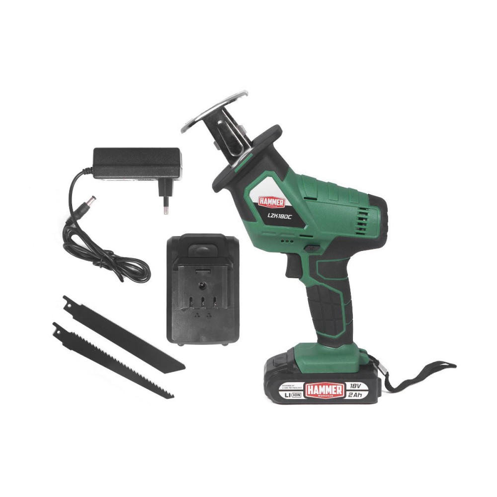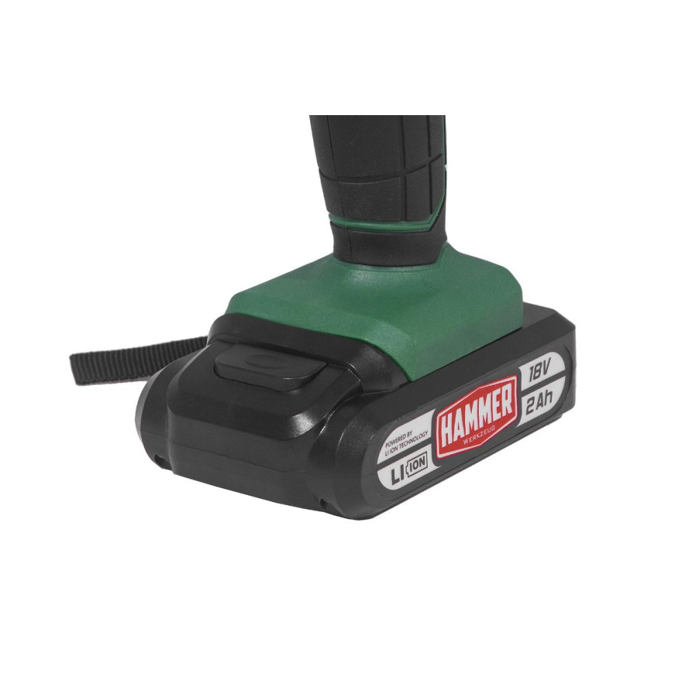 - Поставляется в прочном кейсе с зарядным устройством и двумя аккумуляторами напряжением 18В и емкостью 2 Ач (совместимы с аккумуляторной дрелью Hammer ACD18BS).