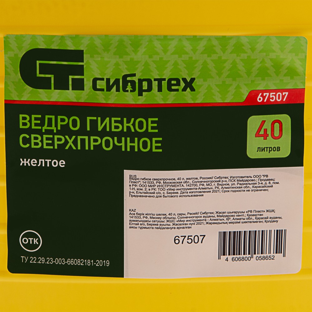 Сверхпрочное гибкое ведро Сибртех 67507 желтого цвета, объемом 40 л, пригодится на даче, стройке, рыбалке, в быту. В нем можно переносить воду для полива, сыпучие материалы для ремонта, замешивать строительные растворы и хранить корм для животных, также ведро пригодится во время сбора урожая.ПреимуществаИзносостойкость — ведро изготовлено из прочного и супергибкого полиэтилена, поэтому выдерживает изгибающие нагрузки и воздействие агрессивных сред.Простой уход — благодаря гладкой внутренней поверхности ведро легко мыть и чистить.Комфортная транспортировка — две цельнолитые ручки повышенной прочности обеспечивают удобный захват.