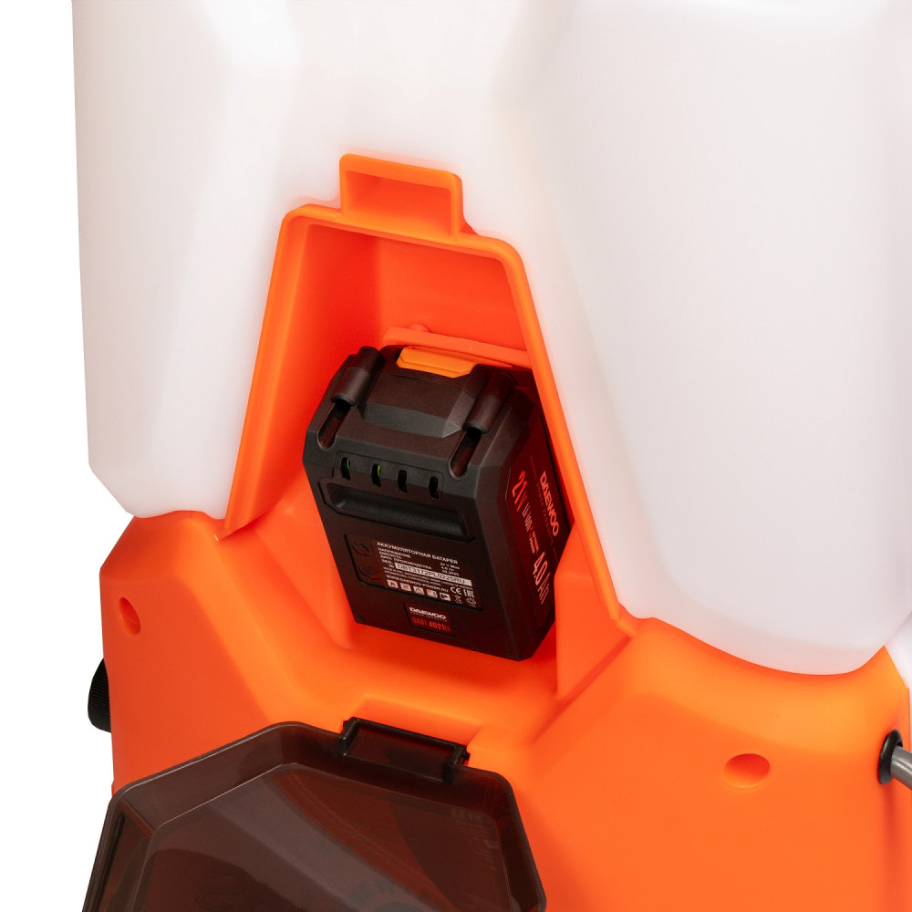 - Высокопроизводительная помпа. Опрыскиватель оснащен мощным насосом, который обеспечивает производительность до 3 л/мин, что позволяет распылять более 350 л жидкости на одном заряде аккумулятора. Функция Auto Stop, которая отключает насос при отсутствии распыления и экономит заряд батареи, увеличит время работы опрыскивателя до 20%.