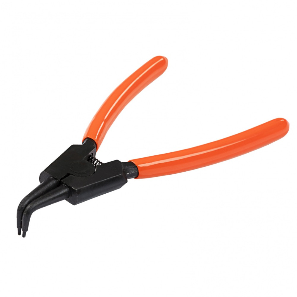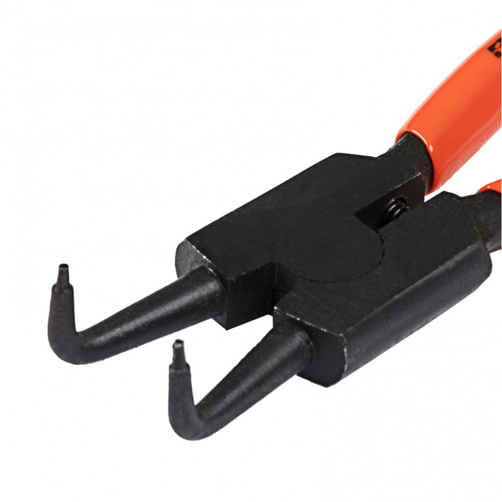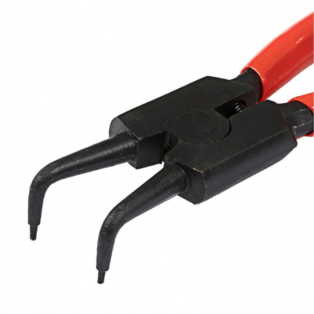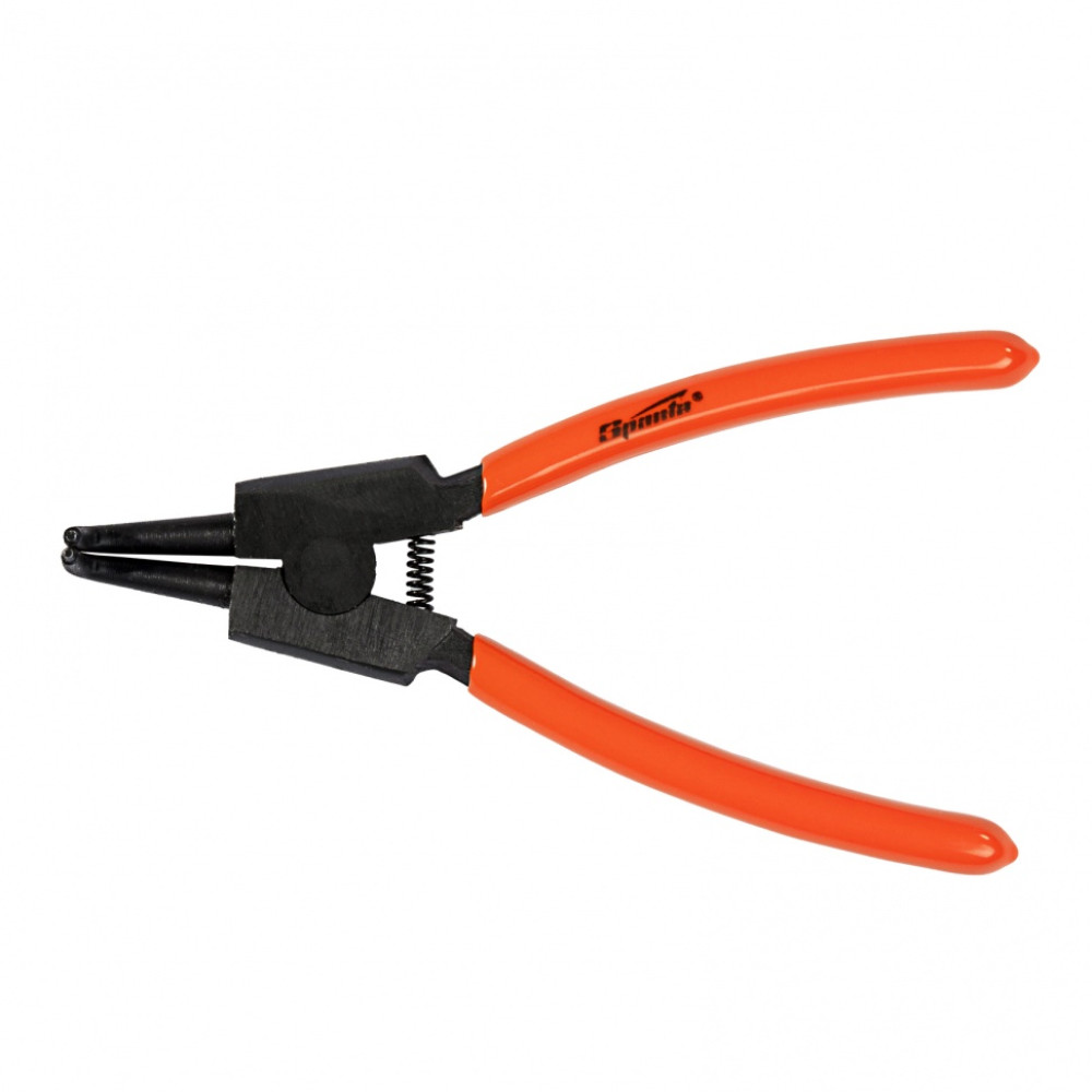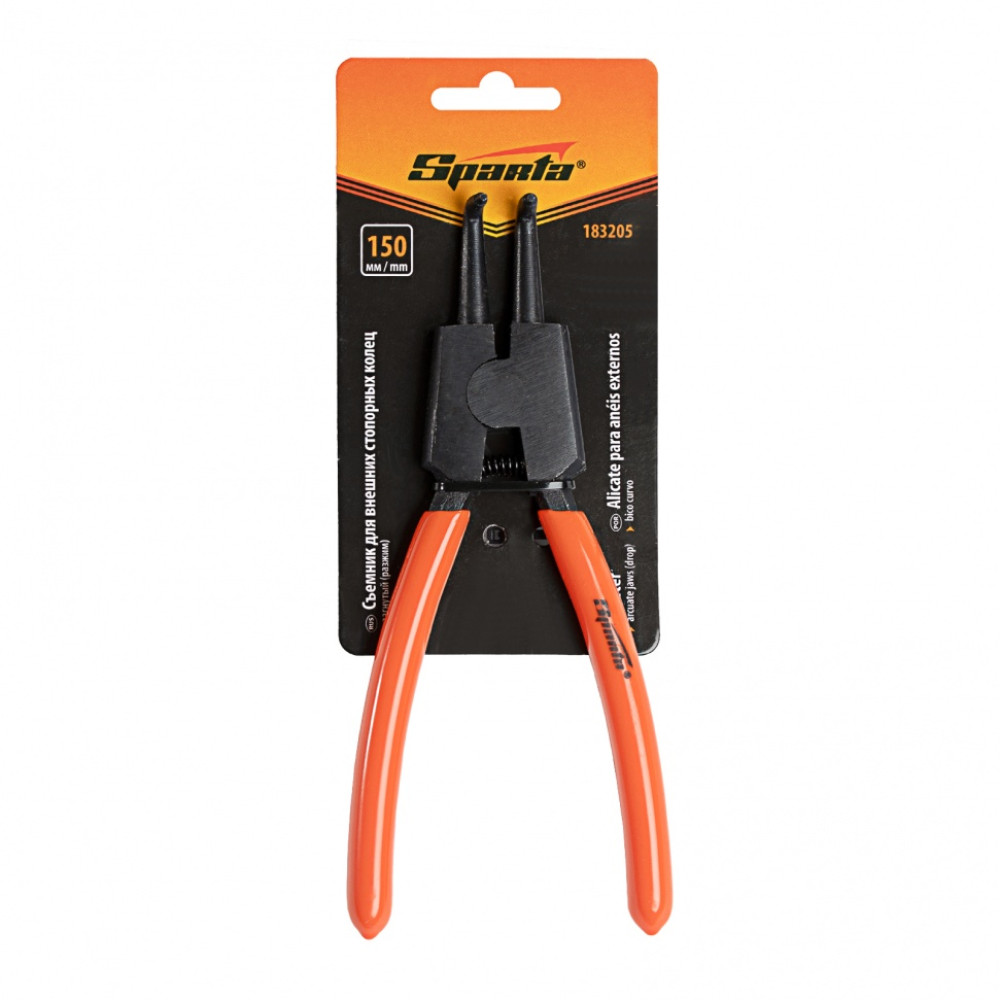 Съемник Sparta 183205 длиной 150 мм, с изогнутыми губками, работает на разжим и предназначен для снятия и установки внешних стопорных колец. Наконечники съемника вставляются в отверстия ушек кольца, при сжатии рукояток кольцо разжимается, и его можно установить на посадочное место. Особая форма наконечников препятствует соскальзыванию с них колец. Съемник стопорных колец используется для ремонта автомобилей, велосипедов, бытовой техники.