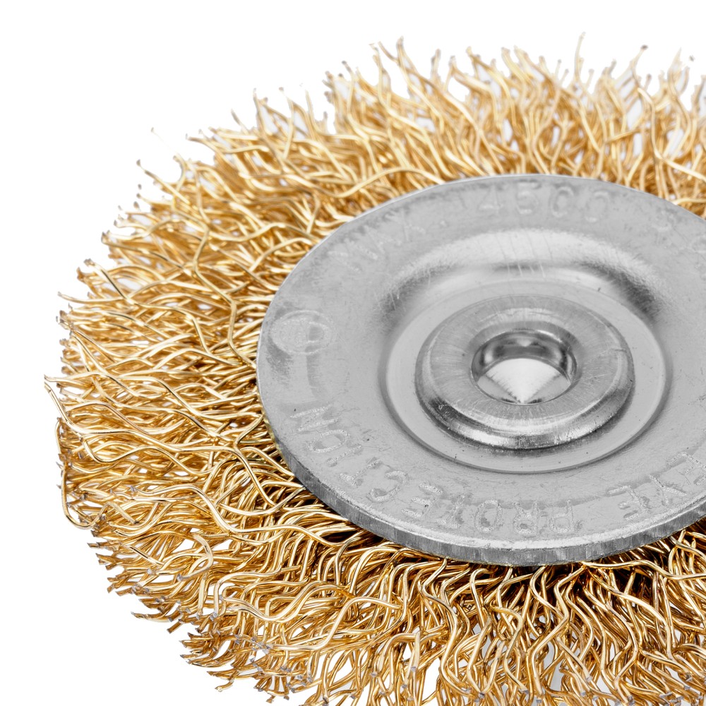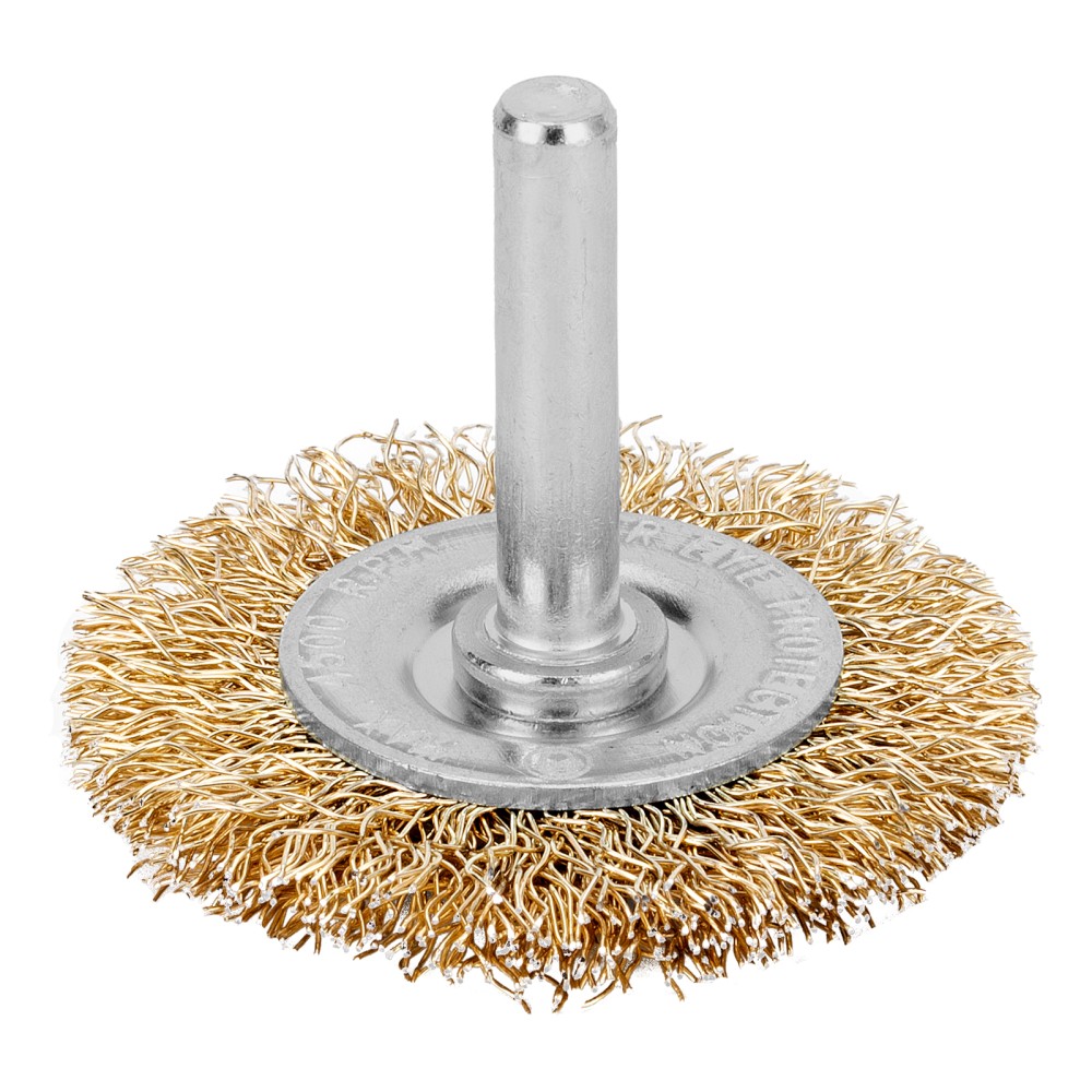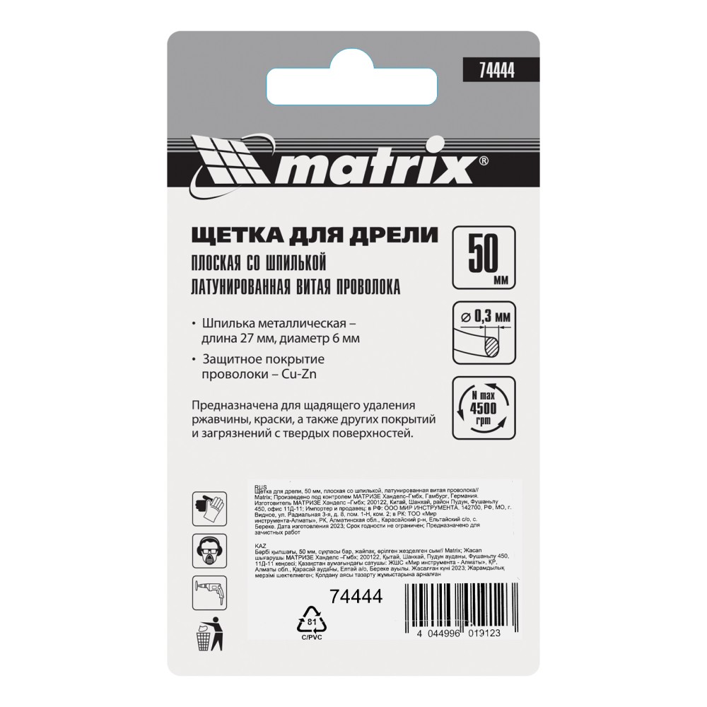 Плоская щетка для дрели Matrix 74444 диаметром 50 мм, со шпилькой и щетиной из латунированной витой проволоки, предназначена для бережной очистки металлических, деревянных, пластиковых поверхностей от загрязнений, старых лакокрасочных материалов и ржавчины. Витая проволока диаметром 0,3 мм проникает в труднодоступные места: пазы, углы, изгибы, узкие участки. Насадку применяют для придания поверхности нужной шероховатости или подчеркивания структуры материала. Хвостовик диаметром 6 мм устанавливается в патрон электродрели, способной работать на рекомендуемой скорости 4500 об/мин. Во время работы следует использовать защитные очки, респиратор, наушники, спецодежду и обувь.ПреимуществаПрочность и долговечность — щетина изготовлена из высококачественной стальной проволоки.Защита от разрушения — корпус оцинкован, щетина латунирована для защиты от коррозии.Гарантированная надежность — оснастка произведена на крупном заводе под строгим технологическим контролем.Широкая область применения — щетка пригодится на строительной площадке, на производственном предприятии, а также будет полезна в быту.