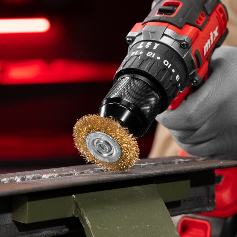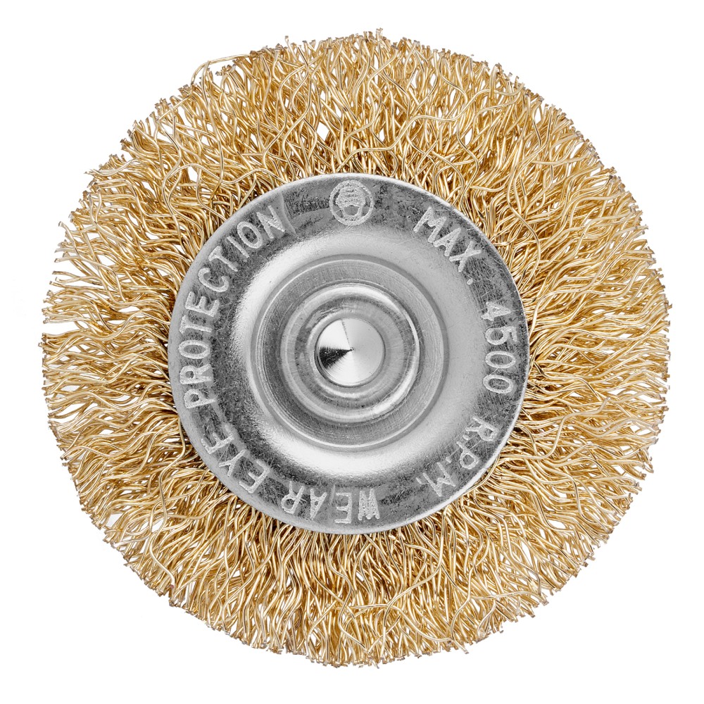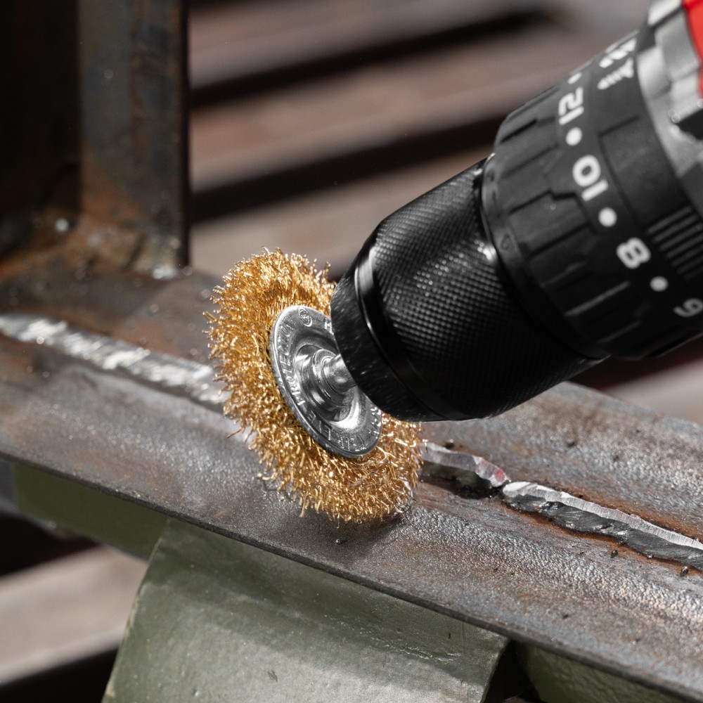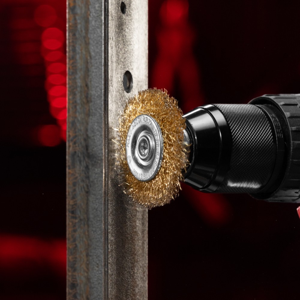 Плоская щетка для дрели Matrix 74444 диаметром 50 мм, со шпилькой и щетиной из латунированной витой проволоки, предназначена для бережной очистки металлических, деревянных, пластиковых поверхностей от загрязнений, старых лакокрасочных материалов и ржавчины. Витая проволока диаметром 0,3 мм проникает в труднодоступные места: пазы, углы, изгибы, узкие участки. Насадку применяют для придания поверхности нужной шероховатости или подчеркивания структуры материала. Хвостовик диаметром 6 мм устанавливается в патрон электродрели, способной работать на рекомендуемой скорости 4500 об/мин. Во время работы следует использовать защитные очки, респиратор, наушники, спецодежду и обувь.ПреимуществаПрочность и долговечность — щетина изготовлена из высококачественной стальной проволоки.Защита от разрушения — корпус оцинкован, щетина латунирована для защиты от коррозии.Гарантированная надежность — оснастка произведена на крупном заводе под строгим технологическим контролем.Широкая область применения — щетка пригодится на строительной площадке, на производственном предприятии, а также будет полезна в быту.