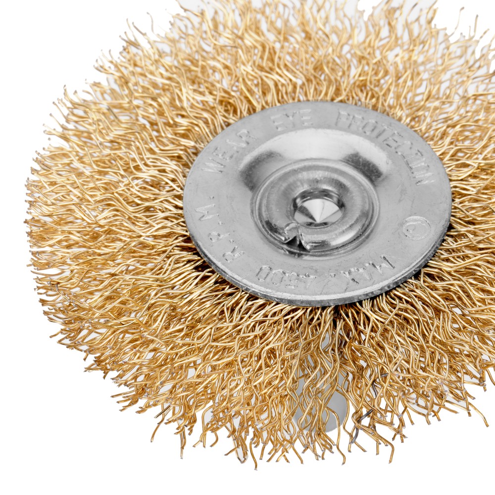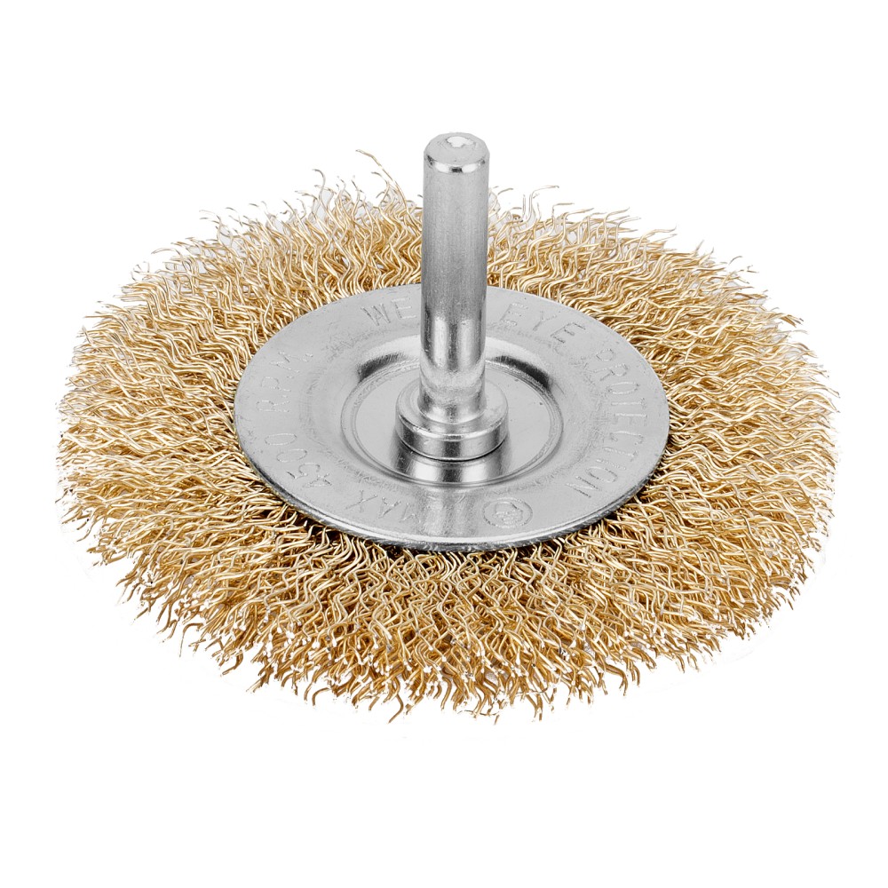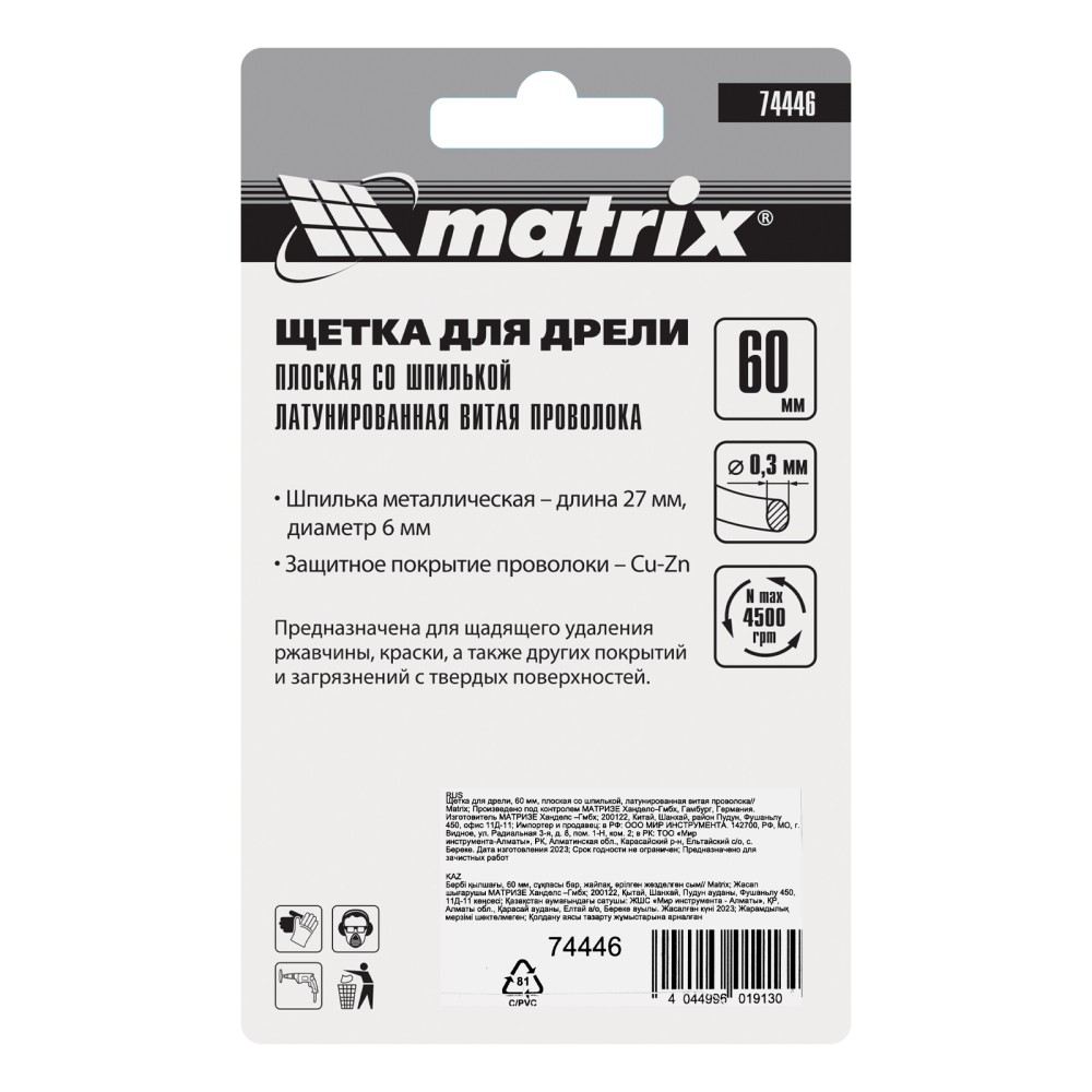 Плоская щетка для дрели Matrix 74446 диаметром 60 мм, со шпилькой и щетиной из латунированной витой проволоки, предназначена для бережной очистки металлических, деревянных, пластиковых поверхностей от загрязнений, старых лакокрасочных материалов и ржавчины. Витая проволока диаметром 0,3 мм проникает в труднодоступные места: пазы, углы, изгибы, узкие участки. Насадку применяют для придания поверхности нужной шероховатости или подчеркивания структуры материала. Хвостовик диаметром 6 мм устанавливается в патрон электродрели, способной работать на рекомендуемой скорости 4500 об/мин. Во время работы следует использовать защитные очки, респиратор, наушники, спецодежду и обувь.ПреимуществаПрочность и долговечность — щетина изготовлена из высококачественной стальной проволоки.Защита от разрушения — корпус оцинкован, щетина латунирована для защиты от коррозии.Гарантированная надежность — оснастка произведена на крупном заводе под строгим технологическим контролем.Широкая область применения — щетка пригодится на строительной площадке, на производственном предприятии, а также будет полезна в быту.