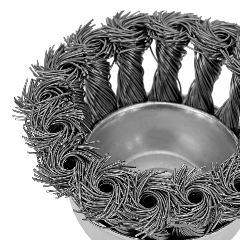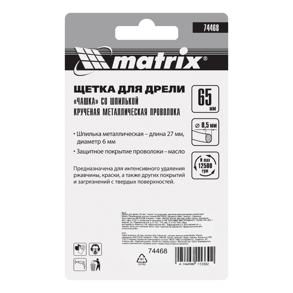Щетка для дрели «чашка» Matrix 74468 диаметром 65 мм, со шпилькой и щетиной из крученой металлической проволоки, — оснастка для электродрелей с патроном под хвостовик диаметром 6 мм. Рекомендуемая скорость вращения 12500 об/мин. Насадку используют для зачистки сварных швов и черновой обработки металлических, деревянных, бетонных поверхностей. Щетка эффективно удаляет толстый слой загрязнений, ржавчины, ЛКМ. Благодаря форме «чашка» насадка оптимальна для обработки значительных по площади поверхностей. Ее применяют в строительстве, машиностроении, а также в быту. Во время работы необходимо использовать средства индивидуальной защиты.ПреимуществаУстойчивость к повышенным нагрузкам — щетина состоит из пучков, скрученных из высококачественной стальной проволоки.Решение широкого спектра задач — диаметр проволоки составляет 0,5 мм, поэтому щетка подходит для работы с различными видами загрязнений.Защита от коррозии — корпус оцинкован, щетина покрыта техническим маслом.Гарантированное качество — щетка изготовлена на крупном заводе с соблюдением всех технологических норм.