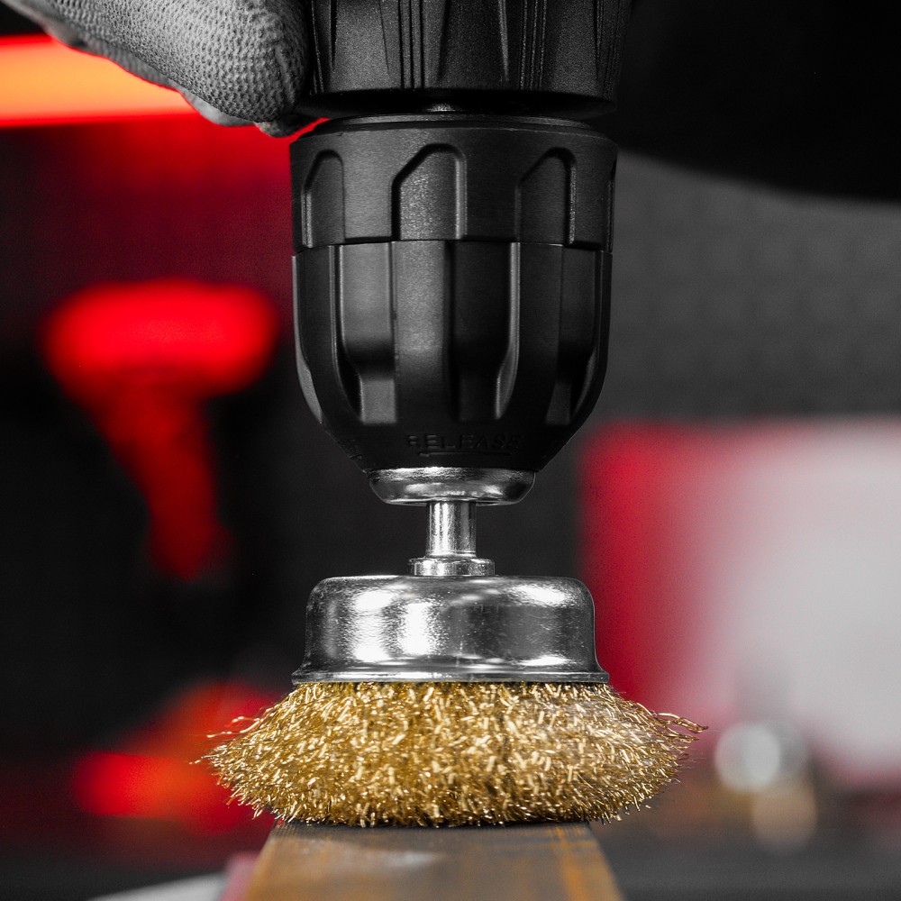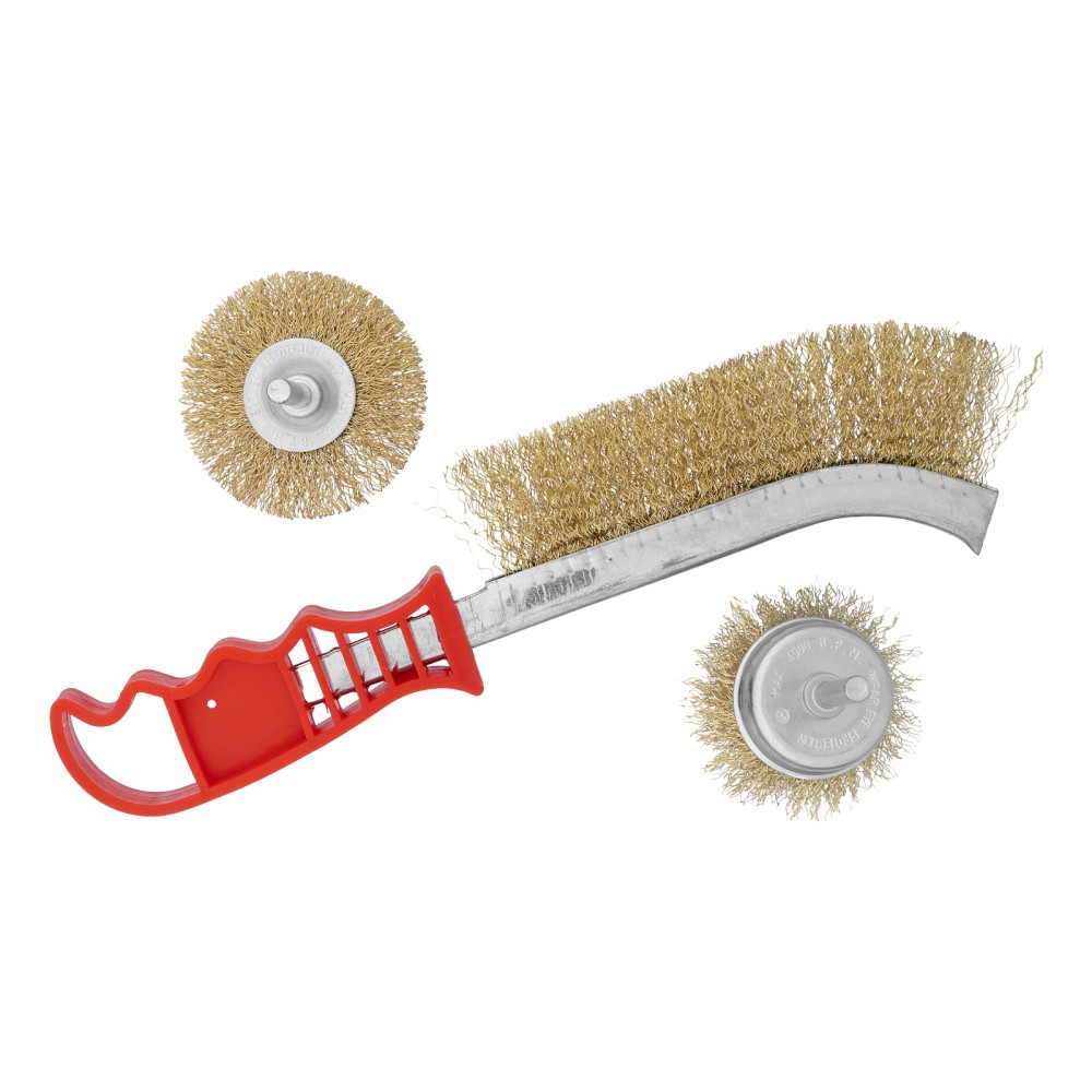 Набор Matrix 74484 состоит из 3 щеток: плоской диаметром 65 мм, «чашки» диаметром 50 мм со шпильками диаметром 6 мм для дрели, а также ручной металлической. Они эффективно удаляют тонкий слой ржавчины, краски, лака, а также убирают загрязнения. Насадкой в форме чашки удобно обрабатывать ровные поверхности, а плоской — работать в пазах и углах. Рекомендовано использование инструмента со скоростью вращения шпинделя до 4500 об/мин. Ручная щетка пригодится для обработки небольших площадей, когда применение электроинструментов нецелесообразно. ПреимуществаПрочность и высокий ресурс — щетина изготовлена из высококачественной стальной проволоки.Универсальность — набор подходит для обработки древесины, металла, пластика и других твердых материалов.Бережное очищение — витая щетина предназначена для щадящей обработки поверхностей.Защита от коррозии — корпусы щеток оцинкованы, а щетина латунирована.Комфортная работа — ручная щетка имеет эргономичную рукоятку с подпальцевыми выемками.