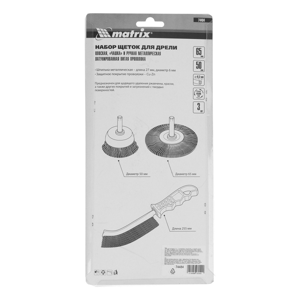 Набор щеток для дрели, 3 шт, 1 плоская, 65 мм, 50 мм "чашка", ручная металлическая Matrix