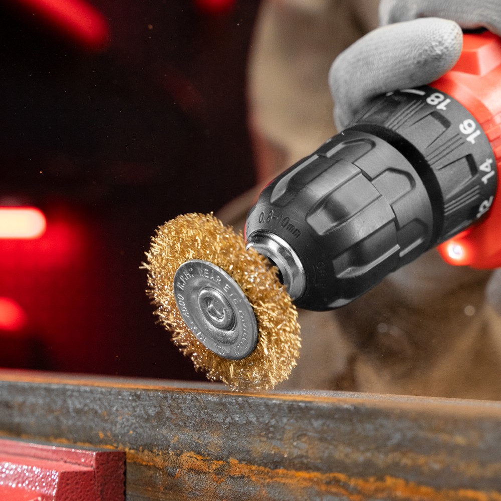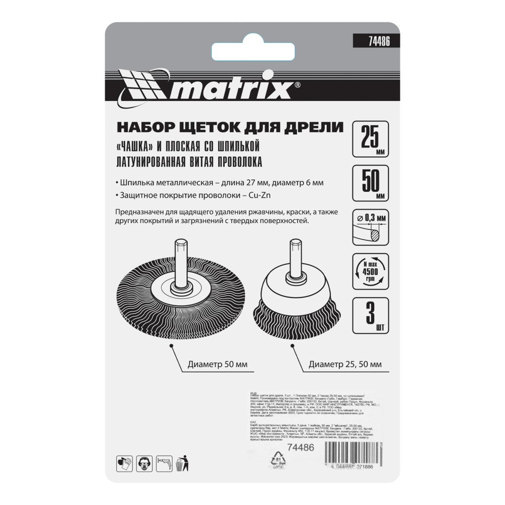 Набор щеток для дрели Matrix 74486 включает 3 насадки со шпильками 6 мм: одну плоскую диаметром 50 мм и две «чашки» диаметром 25 и 50 мм. Рекомендованная скорость вращения шпинделя — до 4500 об/мин. Щетки позволяют снять с поверхностей тонкий старый слой ЛКМ, удалить загрязнения и избавиться от ржавчины. «Чашкой» удобно обрабатывать плоские поверхности, а плоская насадка используется для зачистки труднодоступных мест.ПреимуществаДолговечность — щетина из высококачественной стальной проволоки отличается прочностью и износостойкостью.Универсальность — щетки подходят для обработки любых твердых материалов: древесины, металла, пластика и т.д.Щадящая обработка — витая щетина бережно очищает поверхности, снимая тонкий верхний слой.Антикоррозийная защита — корпусы щеток оцинкованы, а щетина латунирована.