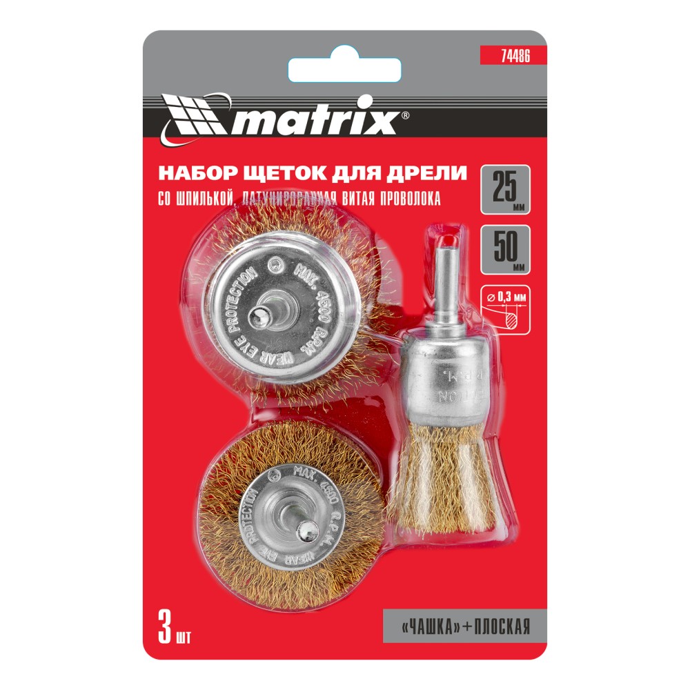 Набор щеток для дрели, 3 шт, 1 плоская, 50 мм, 2 "чашки", 25-50 мм, со шпильками Matrix