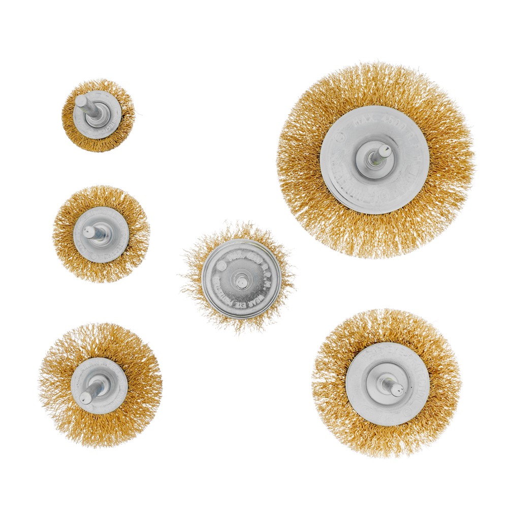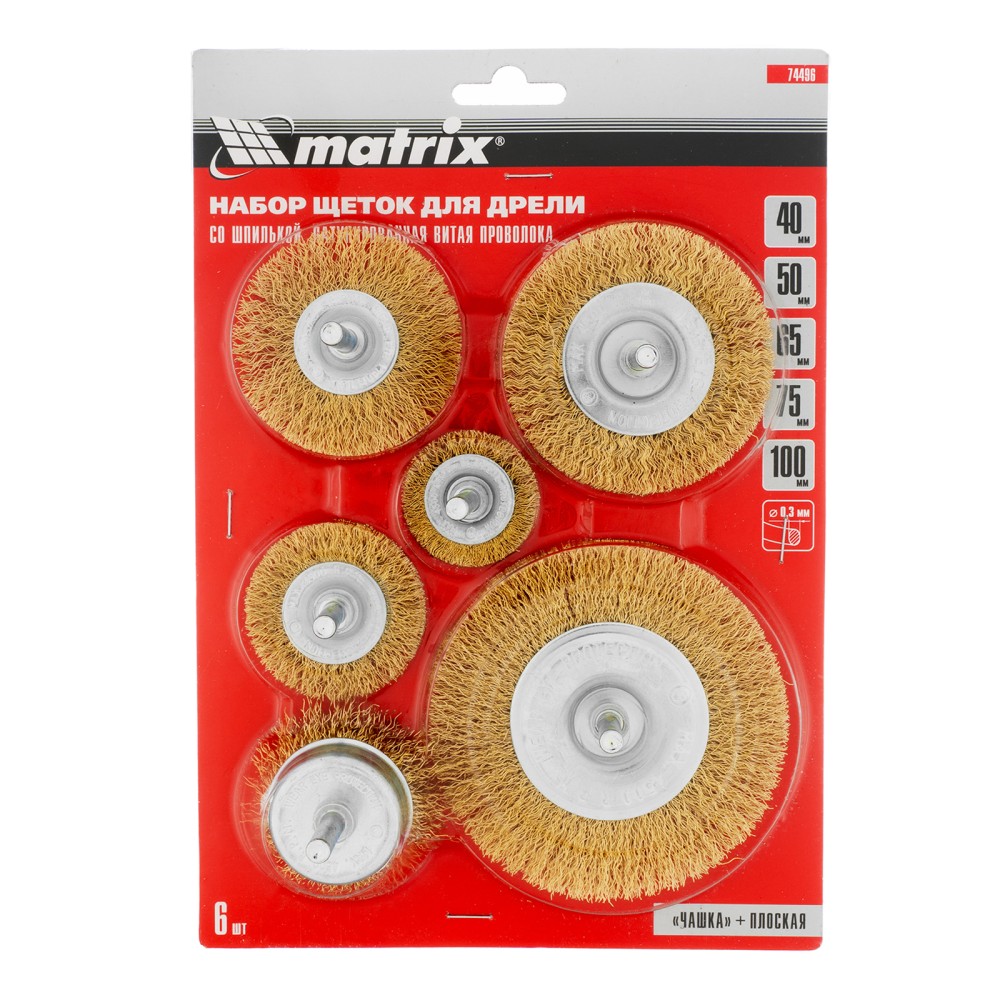 Набор щеток для дрели, 6 шт, 5 плоских 40-50-65-75-100 мм + 1 "чашка" 50 мм, со шпильками Matrix