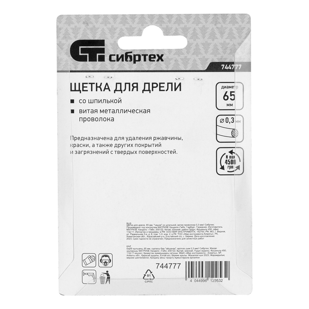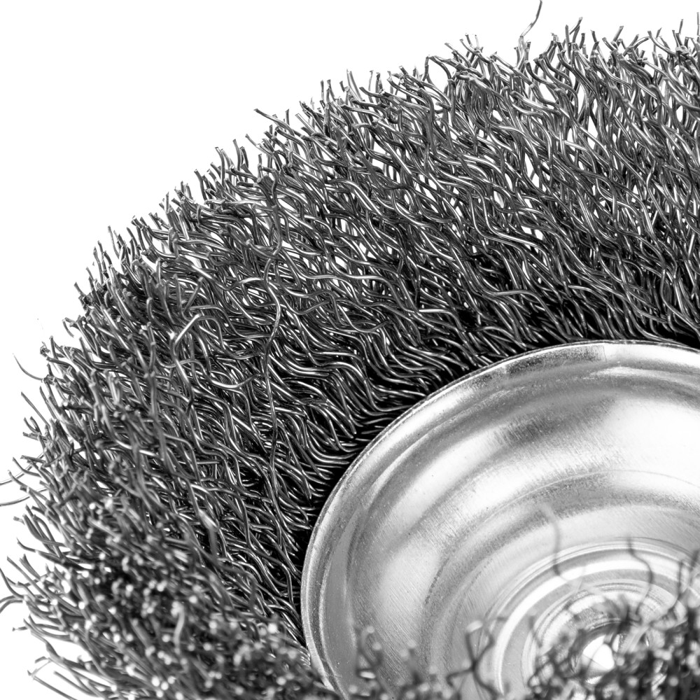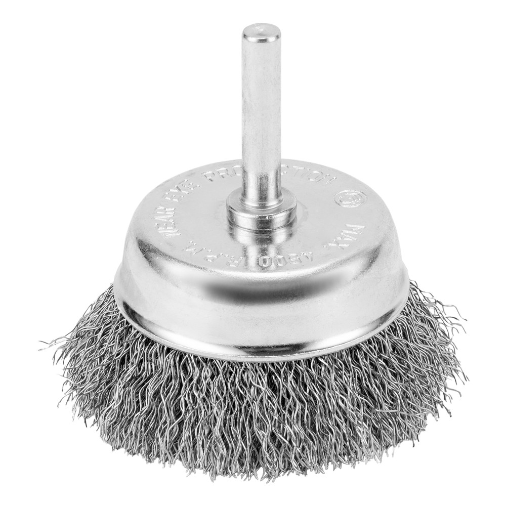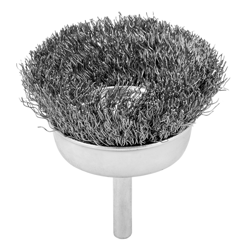 Щетка для дрели «чашка» Сибртех 744777 диаметром 65 мм, со шпилькой и щетиной из витой проволоки 0,3 мм, предназначена для щадящей обработки значительных по площади металлических, деревянных и пластиковых поверхностей — удаления загрязнений, остатков краски и лака, придания шероховатости или подчеркивания структуры материала. Насадка с хвостовиком 6 мм устанавливается в патрон электродрели, поддерживающей работу со скоростью 4500 об/мин. Во время работы с инструментом обязательно использование защитной одежды и обуви, очков, респиратора и наушников. Щетку применяют в профессиональной сфере и в быту.ПреимуществаДолговечность — щетина изготовлена из высококачественной стальной проволоки.Устойчивость к деформации — витая проволока принимает изначальную форму после снятия нагрузок.Высокая производительность — щетка имеет форму чашки, что увеличивает площадь прилегания щетины к обрабатываемой поверхности.Защита от коррозии — корпус оцинкован, щетина покрыта техническим маслом.