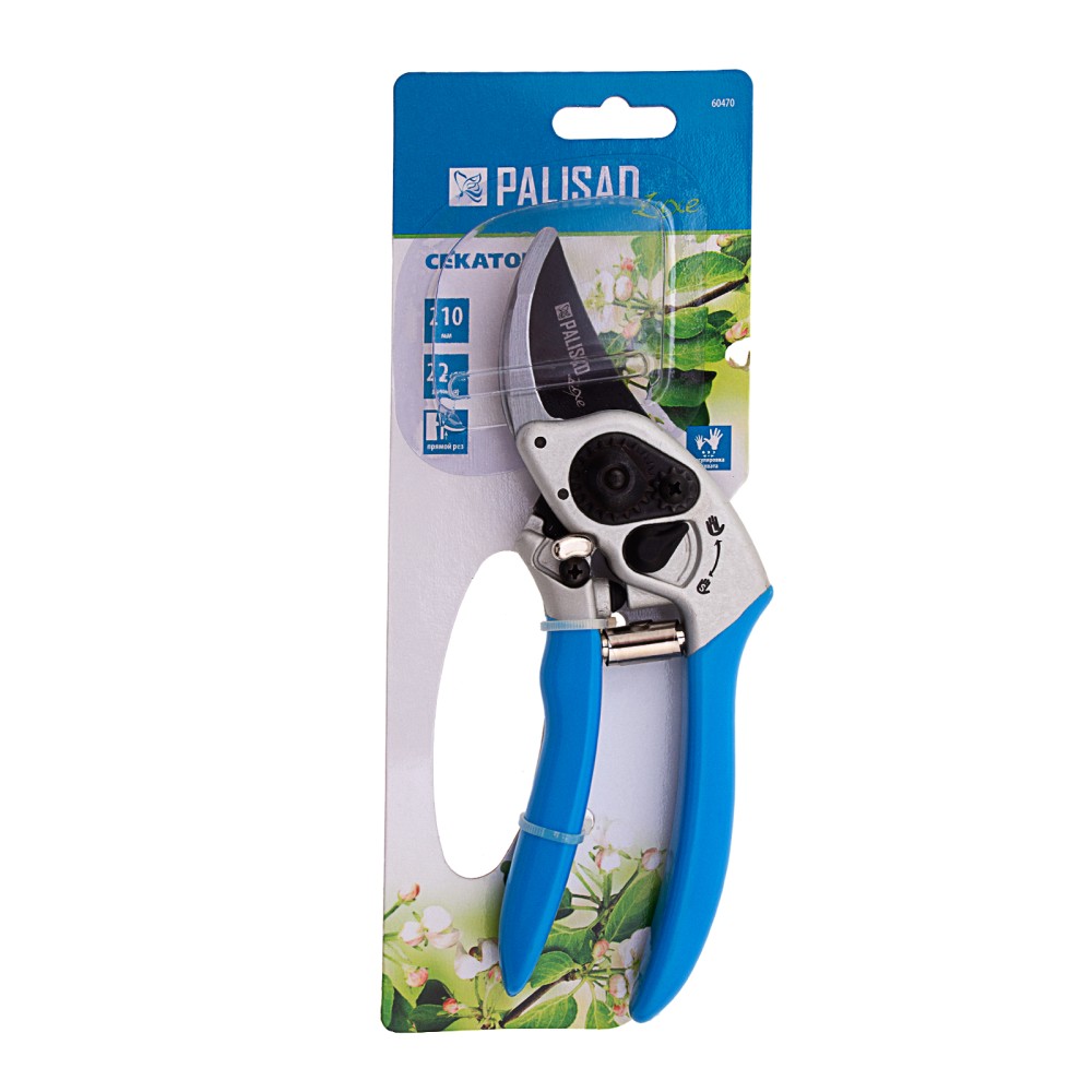 Секатор прямого реза Palisad LUXE 60470 длиной 210 мм, с регулировкой захвата и алюминиевыми рукоятками, используется для обрезки живых веток диаметром до 22 мм. Лезвия расположены в параллельных плоскостях, поэтому срез получается гладким и ровным, а потеря сока растением минимальна. Увеличенный шарнир повышает усилие сжатия на 10%, что облегчает работу. Секатор упрощает уход за растениями на загородном участке.ПреимуществаПрочность — лезвия изготовлены из высококачественной японской инструментальной стали SK-5, литые алюминиевые рукоятки устойчивы к нагрузкам на изгиб и излом.Высокий ресурс — режущее лезвие прошло индукционную закалку, рабочая кромка имеет прецизионную заточку.Легкий рез — тефлоновое покрытие режущего лезвия уменьшает трение.Устойчивость к воздействию влаги — на опорное лезвие нанесено цинковое покрытие, которое, как и тефлоновое покрытие режущего лезвия, предотвращает образование коррозии.Ровный и гладкий срез — регулировочный винт позволяет изменять плотность смыкания лезвий.Удобная работа с ветками разного диаметра — переключатель «большая-малая рука» позволяет регулировать степень раскрытия рукояток.Комфортная работа — ПВХ-покрытие на рукоятках обеспечивает надежный хват.Безопасное хранение и транспортировка — фиксатор надежно удерживает лезвия в закрытом положении.