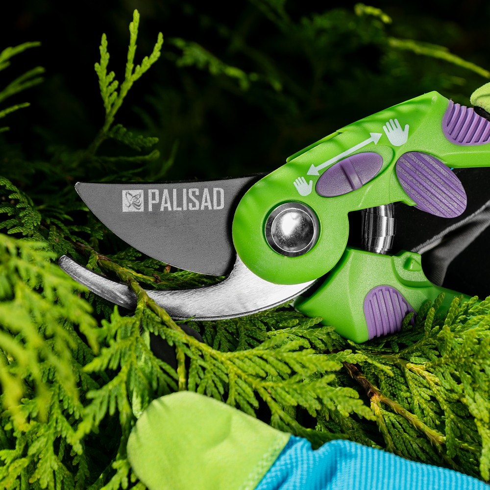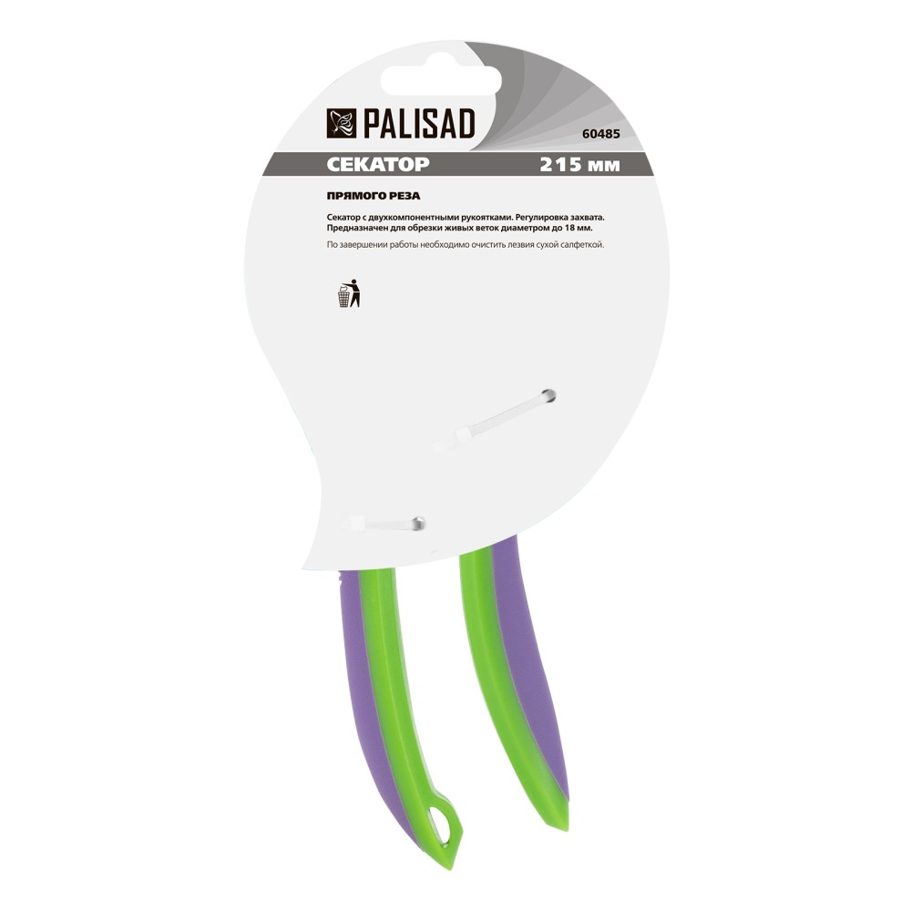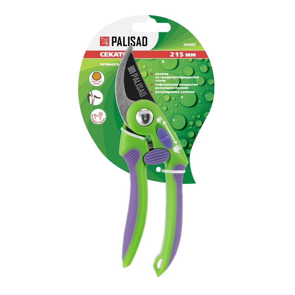 Секатор прямого реза Palisad 60485 длиной 215 мм, с регулировкой захвата и двухкомпонентными рукоятками, позволяет срезать живые ветки диаметром до 18 мм. Режущее лезвие, двигающееся в параллельной плоскости относительно опорного, производит чистый срез, причиняя растению минимальный ущерб. Тефлоновое покрытие уменьшает трение о древесину, что облегчает работу. Инструмент будет полезен на даче и в саду.ПреимуществаПрочность и долговечность — лезвия изготовлены из высокоуглеродистой стали, двухкомпонентные рукоятки не боятся воздействия ультрафиолета.Высокий ресурс — режущее лезвие прошло индукционную закалку, его кромка имеет прецизионную заточку. Контроль качества реза — регулировочный винт позволяет повысить плотность примыкания лезвий.Защита от образования коррозии — на режущее лезвие нанесено тефлоновое покрытие, опорное хромировано.Настройка величины захвата — ширина раскрытия рукояток регулируется при помощи переключателя «большая-малая рука». Комфортная работа — рукоятки со вставками из термопластичной резины обеспечивают надежный хват.Безопасное хранение и транспортировка — фиксатор удерживает лезвия в сомкнутом положении, не давая им самопроизвольно раскрыться.
