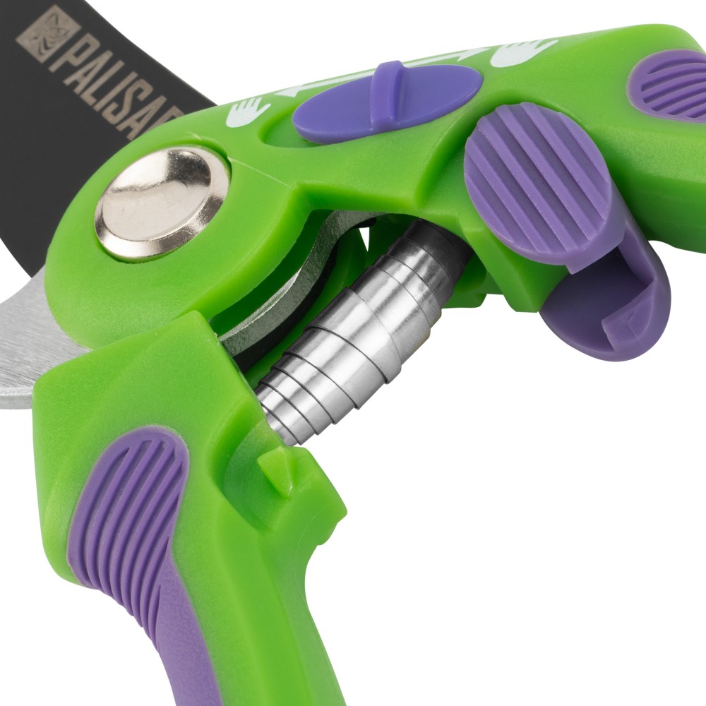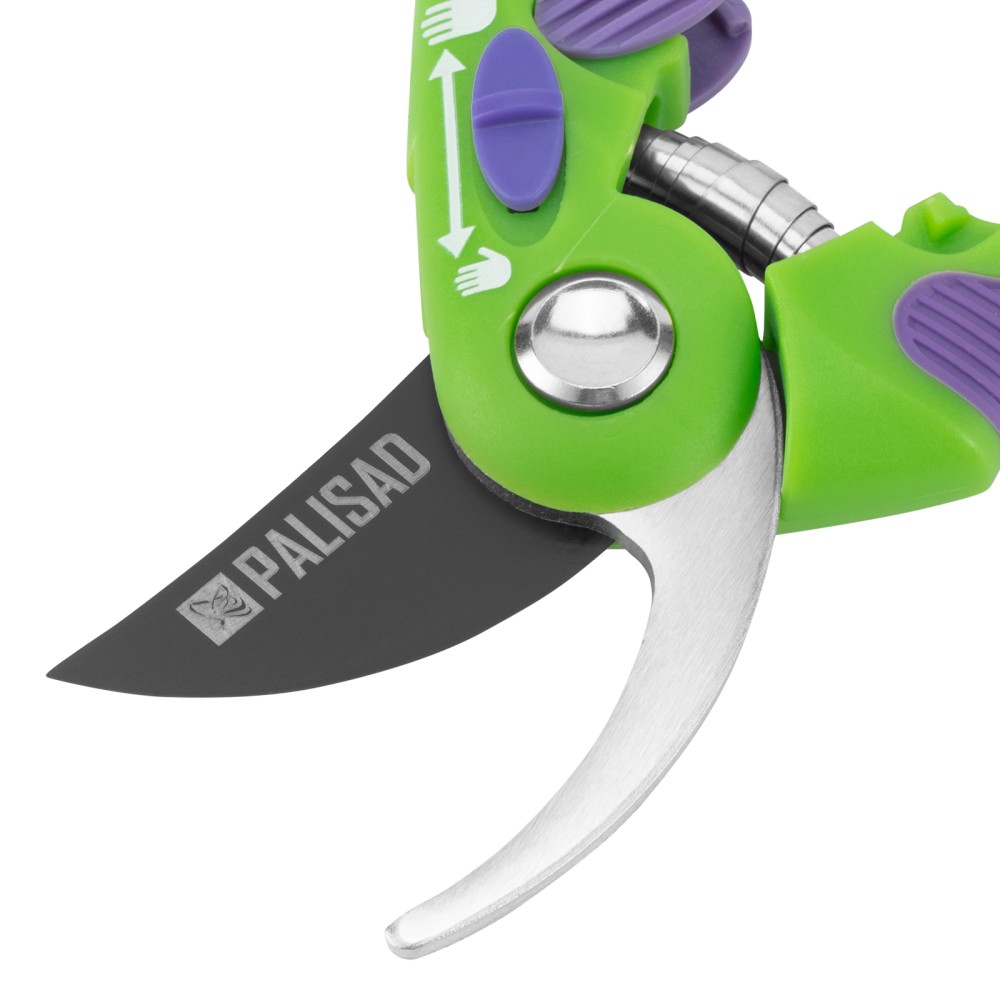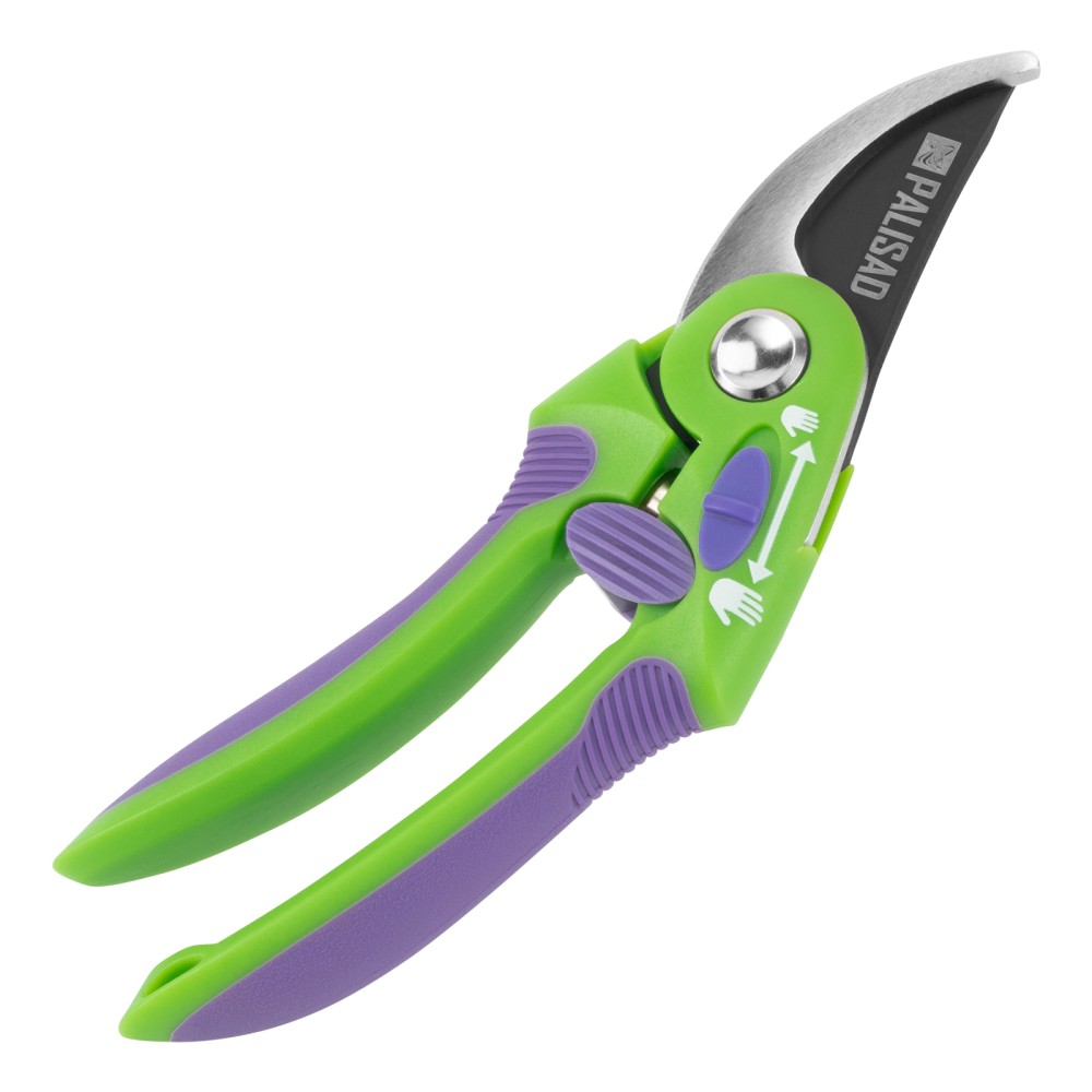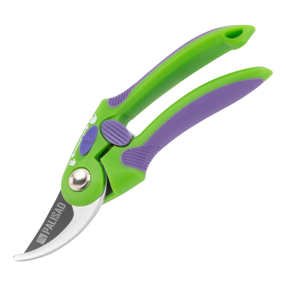 Секатор прямого реза Palisad 60485 длиной 215 мм, с регулировкой захвата и двухкомпонентными рукоятками, позволяет срезать живые ветки диаметром до 18 мм. Режущее лезвие, двигающееся в параллельной плоскости относительно опорного, производит чистый срез, причиняя растению минимальный ущерб. Тефлоновое покрытие уменьшает трение о древесину, что облегчает работу. Инструмент будет полезен на даче и в саду.ПреимуществаПрочность и долговечность — лезвия изготовлены из высокоуглеродистой стали, двухкомпонентные рукоятки не боятся воздействия ультрафиолета.Высокий ресурс — режущее лезвие прошло индукционную закалку, его кромка имеет прецизионную заточку. Контроль качества реза — регулировочный винт позволяет повысить плотность примыкания лезвий.Защита от образования коррозии — на режущее лезвие нанесено тефлоновое покрытие, опорное хромировано.Настройка величины захвата — ширина раскрытия рукояток регулируется при помощи переключателя «большая-малая рука». Комфортная работа — рукоятки со вставками из термопластичной резины обеспечивают надежный хват.Безопасное хранение и транспортировка — фиксатор удерживает лезвия в сомкнутом положении, не давая им самопроизвольно раскрыться.