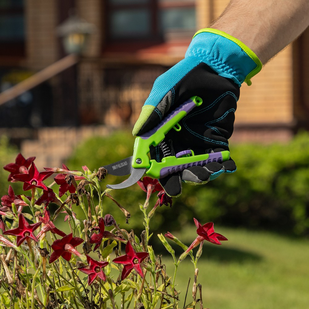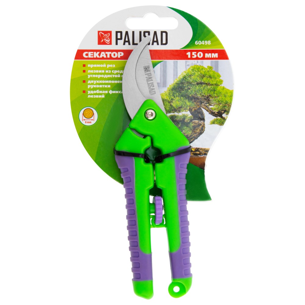 Секатор прямого реза Palisad 60498 длиной 150 мм, с двухкомпонентными рукоятками, используется для формирования крон бонсай и топиариев, а также для ухода за комнатными растениями и овощными культурами. Подходит для срезания живых веток и побегов толщиной до 8 мм. Движущиеся в параллельных плоскостях лезвия производят ровный аккуратный срез с минимальными повреждениями растения. Плотность смыкания лезвий регулируется винтом. Секатор для бонсай будет полезен дома и на даче.ПреимуществаЗащита от разрушения — рабочие части из прочной стали покрыты антикоррозионным маслом.Высокий ресурс — режущая кромка прошла индукционную закалку и имеет прецизионную заточку.Безопасность — фиксатор предотвращает раскрытие лезвий во время хранения и транспортировки.Долговечность — двухкомпонентные рукоятки со вставками из термопластичной резины устойчивы к воздействию ультрафиолета.Надежная конструкция — демпфер между рукоятками предотвращает поломку инструмента.Удобный хват — обрезиненные рукоятки не выскальзывают из руки.