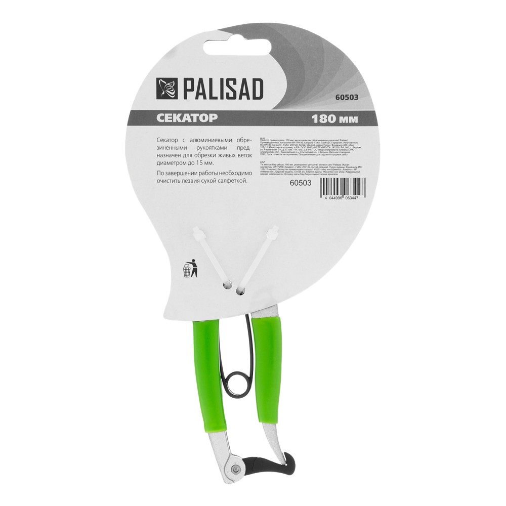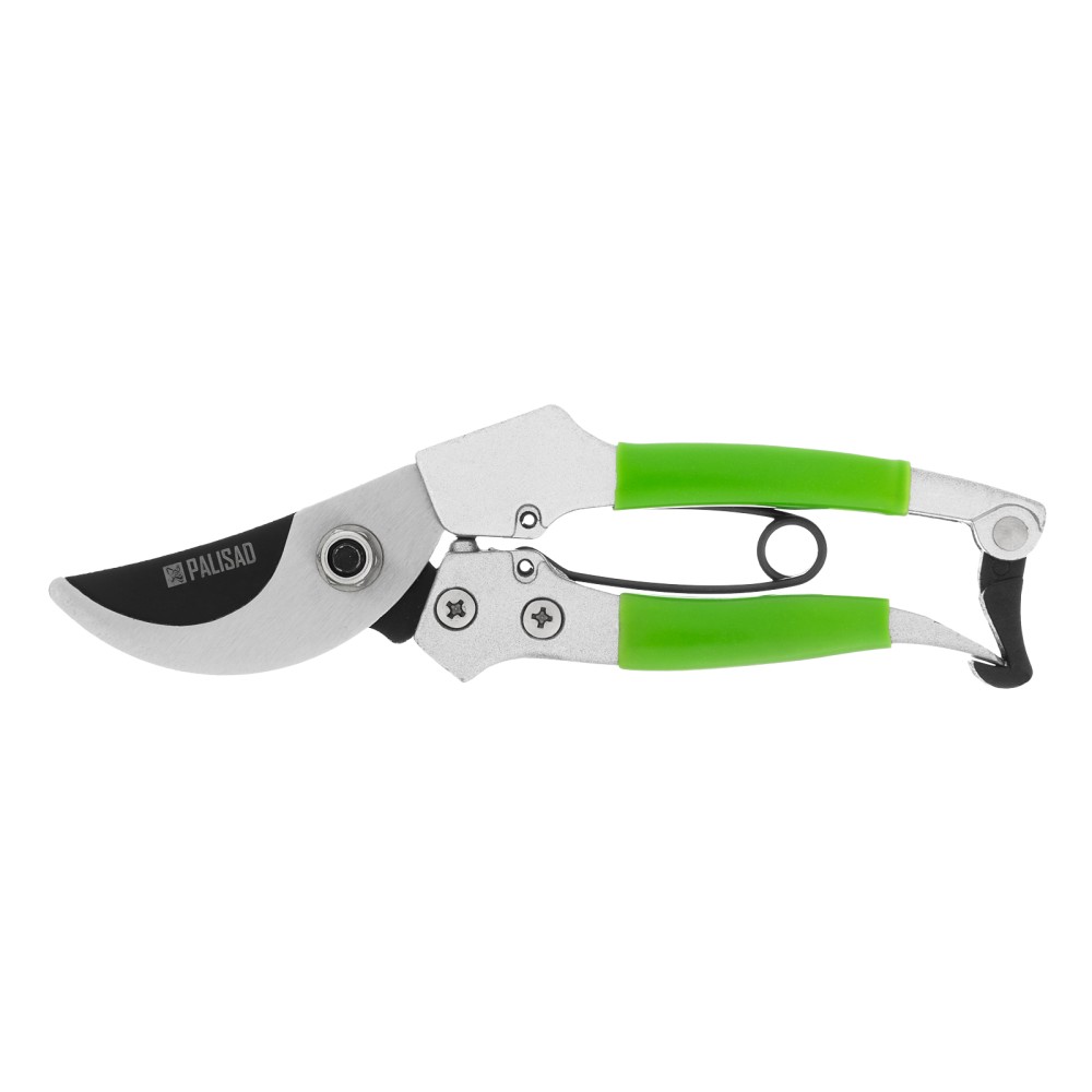 Секатор прямого реза Palisad 60503 длиной 180 мм, с металлическими обрезиненными рукоятками, используется для обрезки живых веток диаметром до 15 мм. Пригодится для ухода за садом и огородом, а также для оформления крон бонсай и создания топиарных скульптур. Параллельно движущиеся лезвия обеспечивают гладкий и ровный срез, минимально повреждая растение. Повысить качество работы секатора можно, отрегулировав плотность смыкания лезвий.ПреимуществаНадежность — инструмент с лезвиями из прочной среднеуглеродистой стали и литыми рукоятками из алюминиевого сплава подходит для активного использования.Высокий ресурс — режущая кромка прошла индукционную закалку и имеет прецизионную заточку.Коррозионная стойкость — режущее лезвие имеет тефлоновое, а опорное — масляное покрытие.Комфортная работа — рукоятки с накладками из термопластичной резины не выскальзывают из ладони.Защита от случайного раскрытия лезвий — удобный фиксатор надежно удерживает рукоятки в сведенном положении во время хранения или транспортировки.