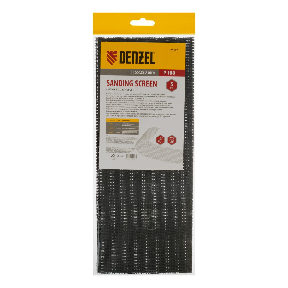 Абразивная сетка Denzel 75177 размером 115 х 280 мм, с зернистостью P 180, 5 шт. в упаковке, применяется для чистовой обработки и придания гладкости зашпаклеванным поверхностям, а также твердой древесине и металлу. Бережно снимает тонкий слой материала и лакокрасочного покрытия, удаляет ржавчину и заусенцы, сглаживает неровности. Обладает высоким ресурсом, т.к. заостренные зерна карбида кремния стачиваются медленно. Сетку устанавливают на ручное шлифовальное приспособление — брусок или сеткодержатель соответствующего типоразмера.ПреимуществаПрочность — основа сетки из стекловолокна устойчива к разрыву.Эффективная работа — благодаря ячеистой структуре полотно практически не забивается продуктами шлифования.Двустороннее нанесение абразивного материала — в случае изнашивания достаточно перевернуть сетку и продолжить работу.Простой уход — рабочее полотно можно очистить легким постукиванием.Удобная комплектация — упаковки из 5 штук хватит для выполнения большого объема работ.