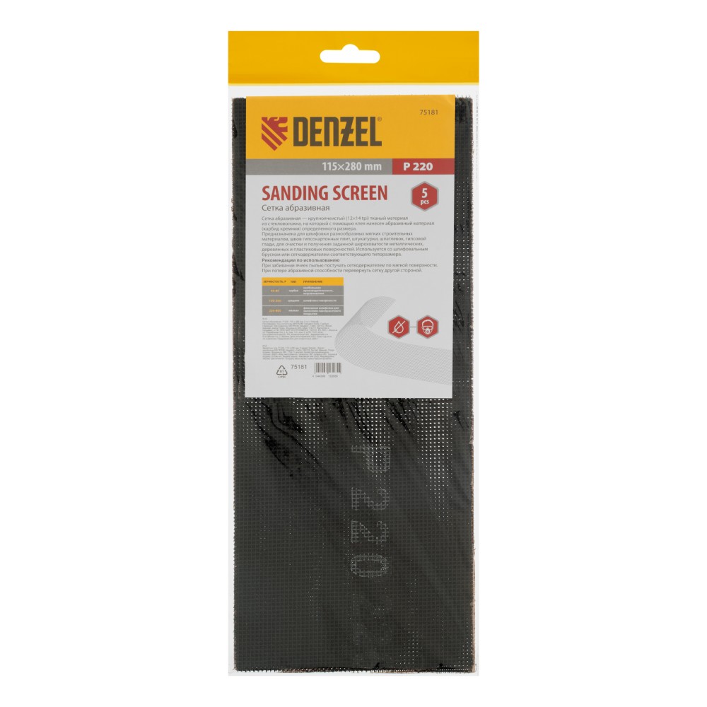 Абразивная сетка Denzel 75181 размером 115 х 280 мм, с зернистостью P 220, 5 шт. в упаковке, применяется для финишной обработки и придания гладкости зашпаклеванным поверхностям, а также твердой древесине и металлу. Бережно снимает тонкий слой материала и лакокрасочного покрытия, удаляет ржавчину и заусенцы, сглаживает неровности. Обладает высоким ресурсом, т.к. заостренные зерна карбида кремния стачиваются медленно. Сетку устанавливают на ручное шлифовальное приспособление — брусок или сеткодержатель соответствующего типоразмера.ПреимуществаПрочность — основа сетки из стекловолокна устойчива к разрыву.Эффективная работа — благодаря ячеистой структуре полотно практически не забивается продуктами шлифования.Двустороннее нанесение абразивного материала — в случае изнашивания достаточно перевернуть сетку и продолжить работу.Простой уход — рабочее полотно можно очистить легким постукиванием.Удобная комплектация — упаковки из 5 штук хватит для выполнения большого объема работ.