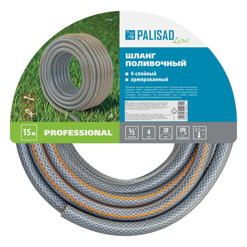 4-слойный армированный поливочный шланг Palisad LUXE «Professional» 67459 длиной 15 м и диаметром 1/2" используется для организации системы полива на даче, в саду, скверах и небольших парках. С его помощью удобно проводить ежедневное орошение газонов и растений. Гибкий напорный шланг оптимально подходит для интенсивной эксплуатации.ПреимуществаВысокий ресурс — шланг выполнен из поливинилхлорида (ПВХ) наивысшего качества и армирован.Максимально прочный армирующий слой — полиэстерная нить с инновационным плетением обеспечивает стойкость к высоким нагрузкам, перегибам и скручиванию.Защита от внешних воздействий — специальное покрытие предотвращает разрушение шланга от перепадов температур и УФ-лучей.Повышенная прочность — за счет толщины стенок 2,2 мм шланг выдерживает давление до 35 бар.Универсальность — изделие совместимо со всеми поливочными системами Palisad и Palisad LUXE.