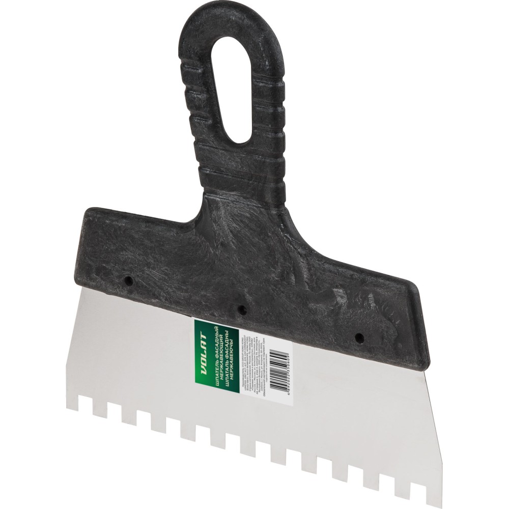 Зубчатый шпатель представляет собой вспомогательный инструмент для ручной укладки плитки. Металлические зубья предназначены для равномерного распределения клея или другой строительной смеси по поверхности укладываемого элемента. Толщину слоя при этом можно варьировать, изменяя степень нажатия на шпатель и угол наклона зубьев. Удобная ручка из пластика имеет отверстие для хранения шпателя в подвешенном положении.