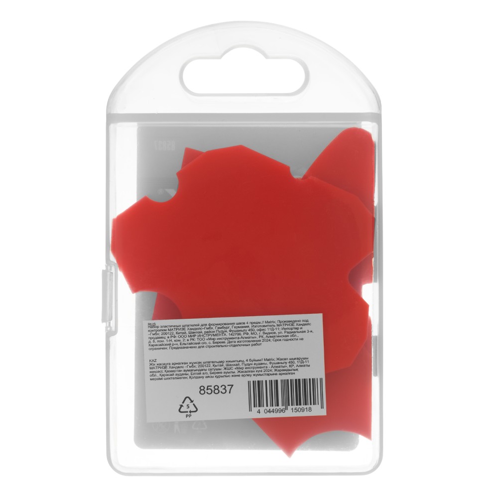Набор из 4 эластичных шпателей Matrix 85837 используется для формирования аккуратных межплиточных швов и удаления излишков герметика. Универсальные шпатели имеют множество профилей для создания швов различного размера и формы.ПреимуществаЭффективная работа — шпатели выполнены из термопластичной резины, поэтому не допускают налипания герметика и не оставляют царапин.Быстрый поиск нужного инструмента — на каждый шпатель нанесена разметка с обозначением длины, радиусов и углов.Удобное хранение и транспортировка — набор упакован в пластиковый футляр.