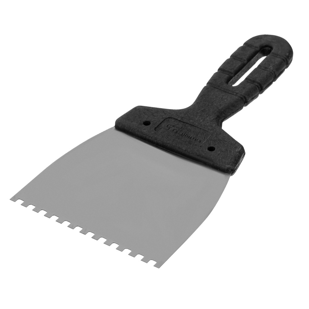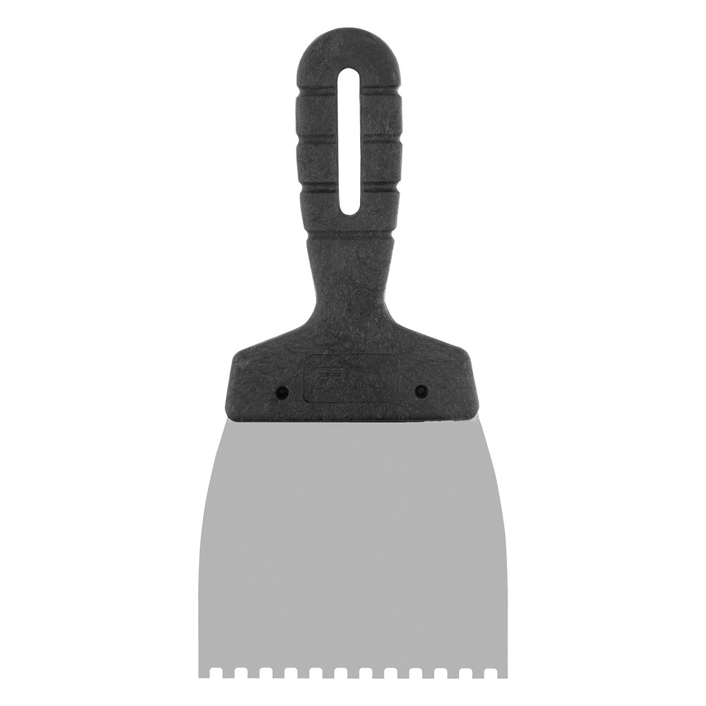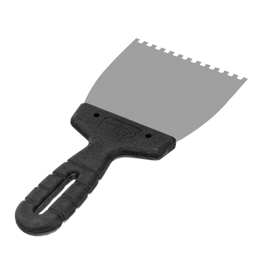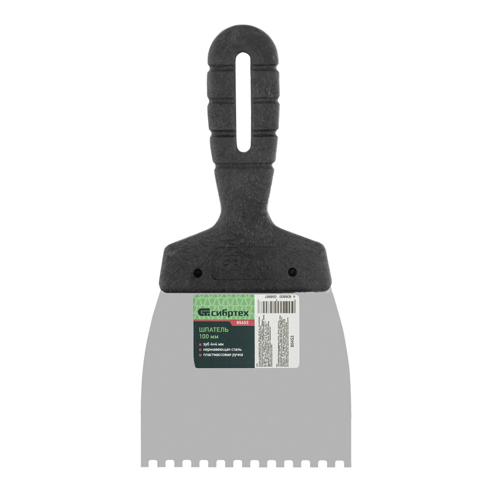 Шпатель Сибртех 85453 из нержавеющей стали, шириной 100 мм, с пластмассовой рукояткой и зубьями 4 х 4 мм, применяется во время проведения работ по укладке плитки, мозаики и т. д. Квадратные зубья облегчают нанесение клеевого состава, позволяя равномерно распределять его по поверхности. Зубья размером 4 х 4 мм рассчитаны на плитку площадью 50-100 см2.ПреимуществаУпругость — полотно быстро восстанавливает свою форму при изгибающих нагрузках.Коррозионная стойкость — рабочее полотно выполнено из нержавеющей стали.Комфортная эксплуатация — наклонная рукоятка облегчает нанесение и выравнивание раствора.Эргономичность — за счет рельефной текстуры рукоятка удобно ложится в руку и не выскальзывает из ладони.Удобное хранение — в рукоятке предусмотрено отверстие для подвешивания шпателя.